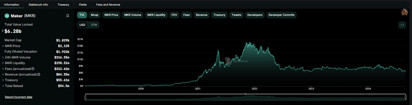 DefiLlaman tietojen mukaan Maker on neljänneksi suurin DeFi-protokolla, jonka lukittu kokonaisarvo (TVL) on 6,28 miljardia dollaria. Tiedot myös osoittavat, että DAI on kolmanneksi suurin stablecoin, jääden jälkeen Tetherin USDT:stä ja Circlen USDC:stä. DAI:n markkina-arvo on 5,25 miljardia dollaria kirjoitushetkellä.