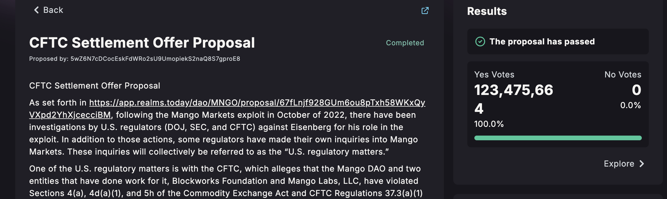 SEC otti erityisen kiinnostuksen tähän petostapaukseen, kun se oli vielä käynnissä, ja sääntelijöiden silmät ovat olleet Mangon markkinoilla siitä lähtien. Itse asiassa Mango DAO äänesti myös ylivoimaisesti ennakoivasti toisen sopimuksen tarjoamisesta. Viitaten meneillään oleviin tutkimuksiin SEC:ltä, CFTC:ltä ja DOJ:lta, Mango DAO ehdotti 500 000 dollarin sopimusta CFTC:n lopettamiseksi.