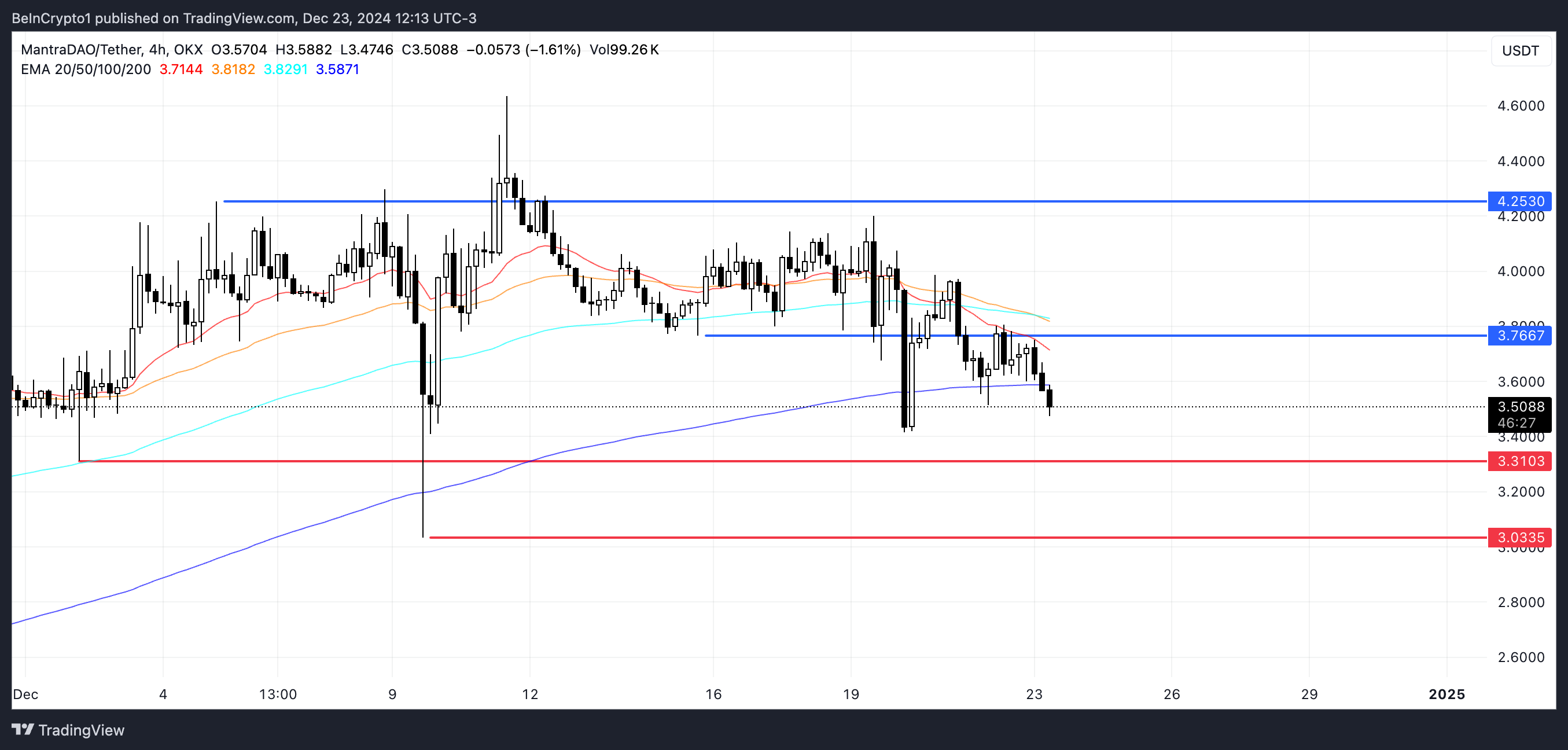 Mantra (OM) -kolikon hinta kohtaa kriittisen teknisen vaiheen, kun useat indikaattorit viittaavat mahdolliseen karhumarkkinapaineeseen. DeFi-token on laskenut 13 % viimeisen seitsemän päivän aikana, jatkaen korjaustaan kaikkien aikojen korkeimmasta tasosta, joka saavutettiin 18. marraskuuta, ja nykyiset hinnat ovat 21 % alhaisemmat kuin tuo huippu.