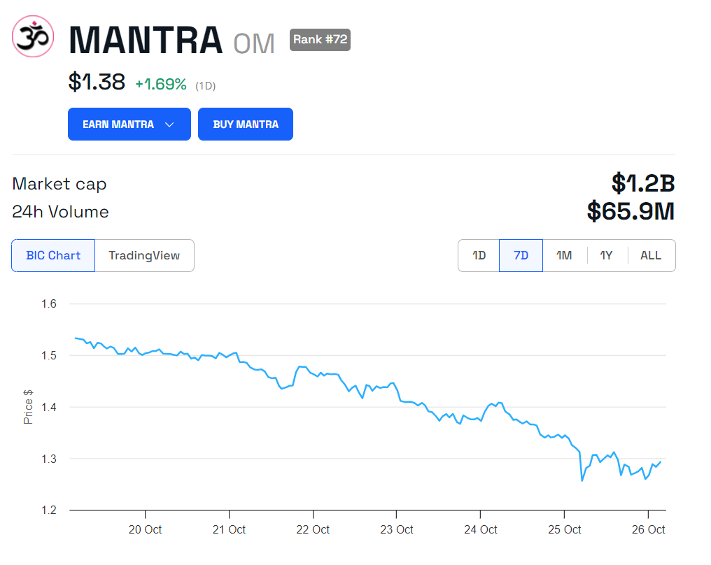 OM on edelleen suurin RWA-token markkinoilla, 1,2 miljardin dollarin markkina-arvolla, ja sitä seuraa tiiviisti ONDO. Tokenin viimeaikainen suorituskyky johtuu pääasiassa likvidoinnista sen jälkeen, kun OM saavutti kaikkien aikojen korkeimman hintansa 14. lokakuuta.