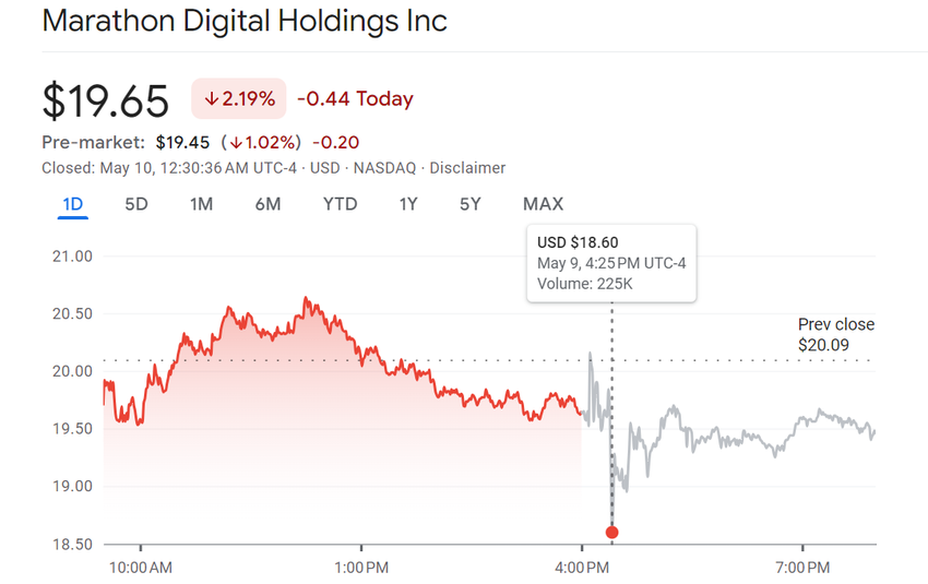 Marathon Digitalin osakkeen (MARA) hinta laski tulosraportin jälkeen. Tunnin jälkeisen kaupankäynnin aikana MARAn hinta putosi 18,60 dollariin 9. toukokuuta. Pidemmällä aikavälillä MARAn hinta on laskenut 14,30% tähän päivään mennessä.