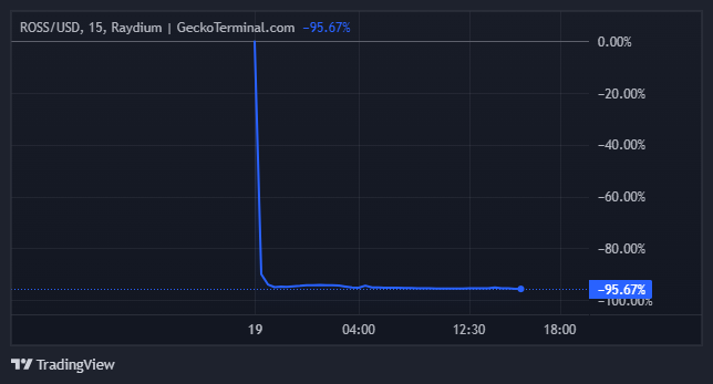 GeckoTerminalin tiedot osoittavat, että ROSS on laskenut yli 95 % viimeisen 24 tunnin aikana ja käy kauppaa lähellä pohjahintaansa.