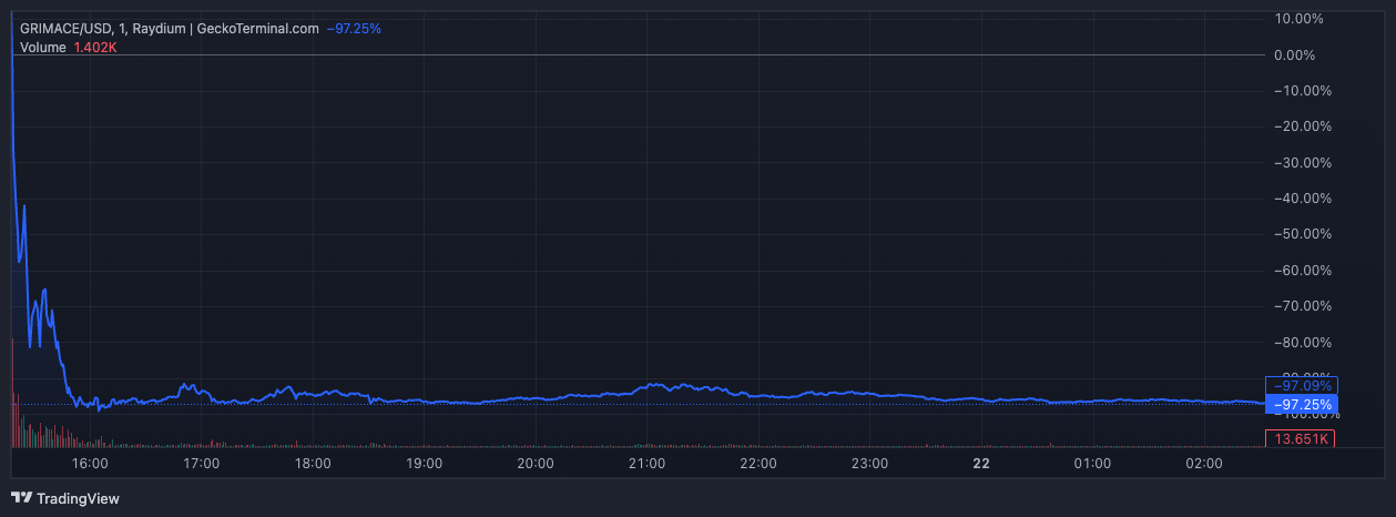 Vain 30 minuutissa väärennetty “GRIMACE” meemikolikko nousi arvossa. Kuitenkin hakkerit kotiuttivat varat, pudottaen kolikon arvon lähes nollaan.