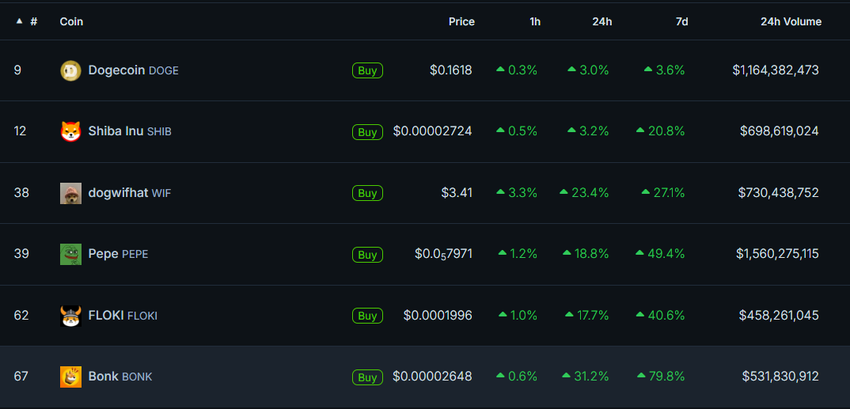 Muut tämän luokan tokenit, kuten PEPE, dogwifhat (WIF) ja MAGA (TRUMP), ovat keränneet huomattavia voittoja. Markkinatiedot korostavat, että BONKin ralli on keskellä lisääntynyttä kaupankäyntiä. CoinGecko raportoi kaupankäyntivolyymista , joka nousi keskiviikkona yli 531 miljoonaan dollariin, mikä on merkittävä harppaus edellisen päivän 177 miljoonasta dollarista.