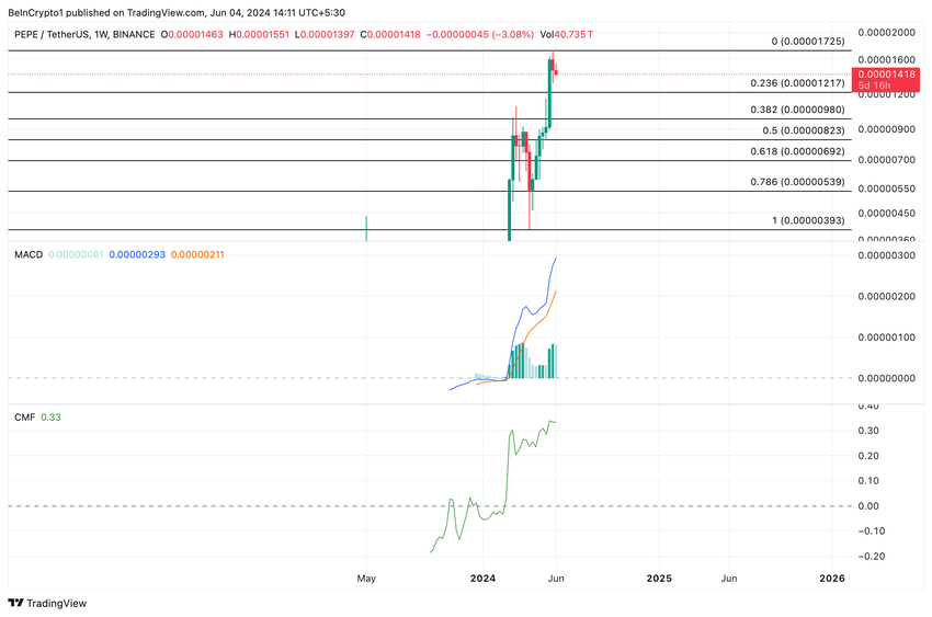 Lisäksi PEPEn nouseva ja positiivinen Chaikin Money Flow (CMF) vahvisti nousevan trendin. Kello 0,33 PEPE:n CMF merkitsi likviditeetin nousua meemikolikkomarkkinoille.