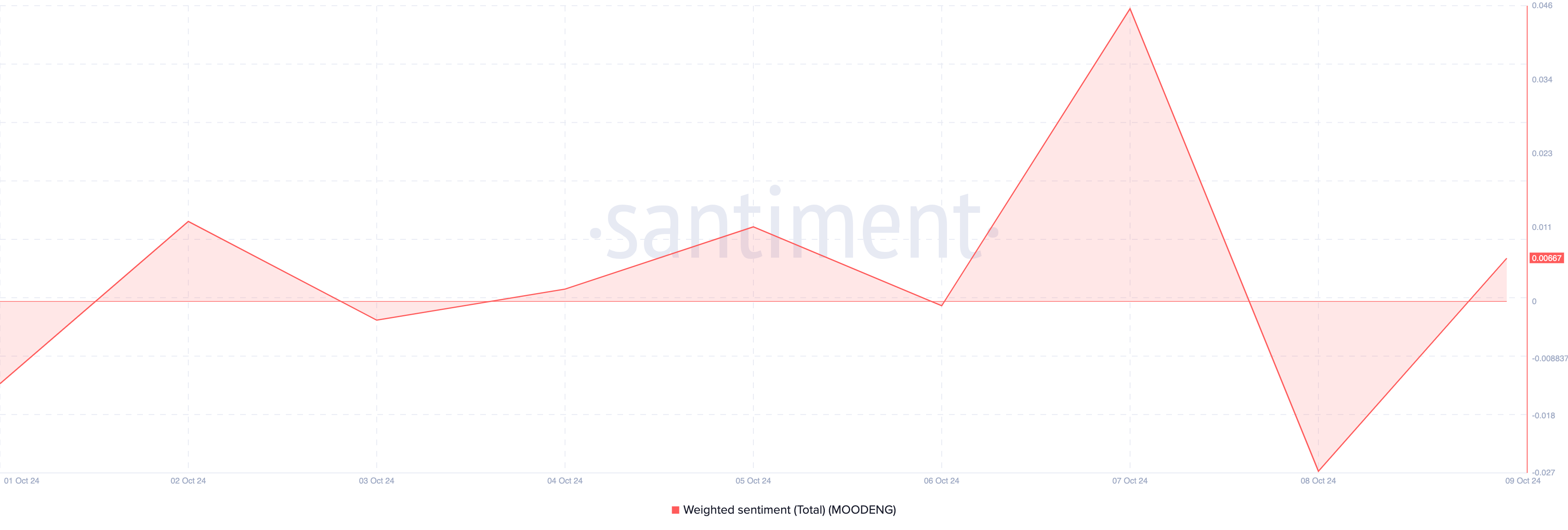 Nousu heijastaa uudistunutta luottamusta kryptovaluuttaan, ja Santimentin ketjuanalyysi on samaa mieltä. Santimentin mukaan Moo Dengin ympärillä oleva painotettu tunnelma, joka aiemmin oli negatiivisella alueella, on ponnahtanut positiiviseen vyöhykkeeseen.