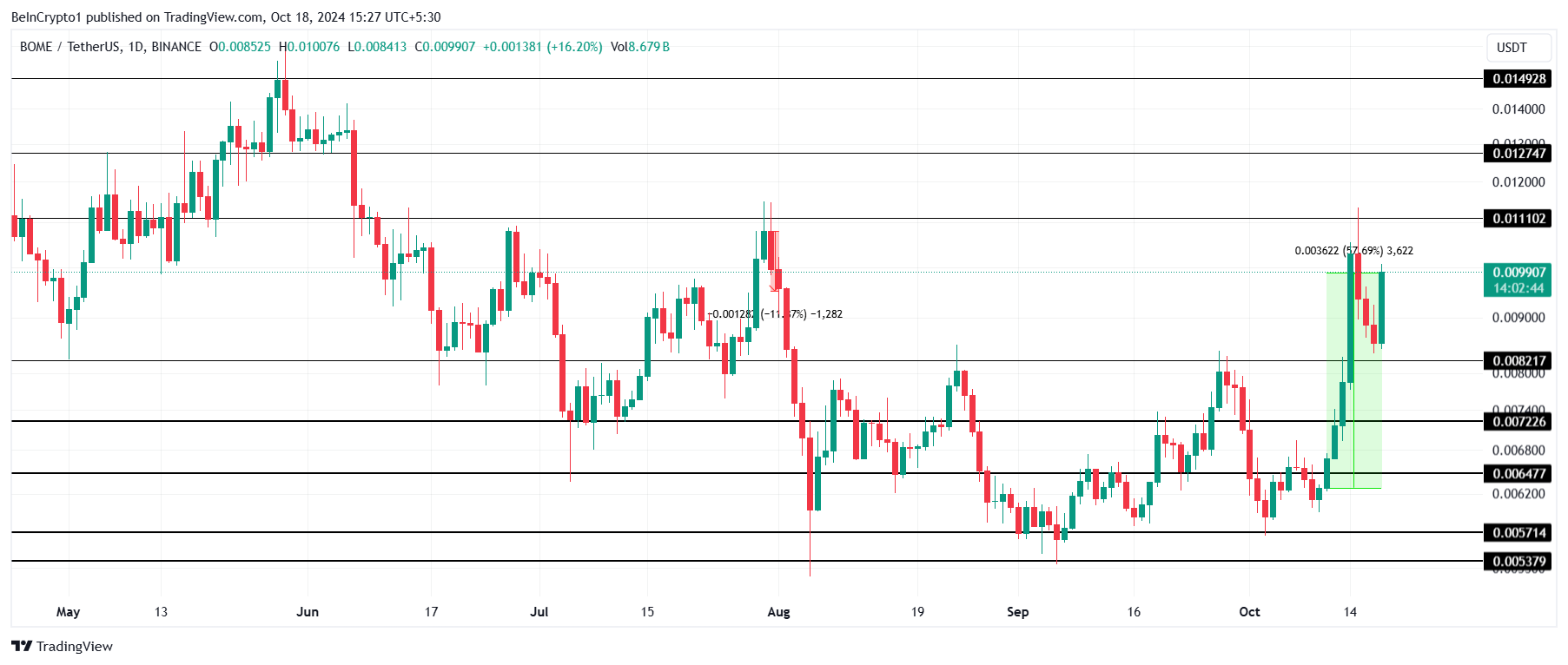 Kuitenkin, jos BOME onnistuu murtamaan 0,0111 dollarin vastustustason, se merkitsisi merkittävää saavutusta—neljän kuukauden korkein hinta kolikolle. Tällainen läpimurto voisi työntää hinnan kohti 0,0127 dollaria.