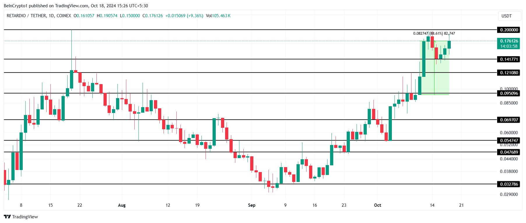 Retardion hinta on noussut 88 % viimeisen seitsemän päivän aikana, lähestyen 0,20 dollarin rajaa ja muodostaen uuden kaikkien aikojen korkeimman hinnan. Viimeaikainen hintaralli on herättänyt optimismin sijoittajien keskuudessa, kun meemikolikko on saanut merkittävää vauhtia.