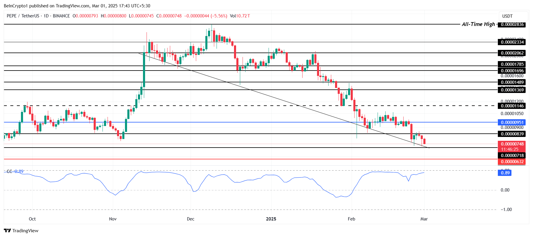 PEPE jatkaa laskutrendiään, käyden kauppaa hintaan 0,00000718 dollaria aloitettuaan tämän laskun marraskuussa 2024. Altcoinin hinta on edelleen paineen alla, mutta tilanne voi muuttua. Erityisesti PEPE:llä on vahva 0,89 korrelaatio Bitcoiniin, mikä voi luoda edellytykset palautumiselle, jos BTC elpyy.