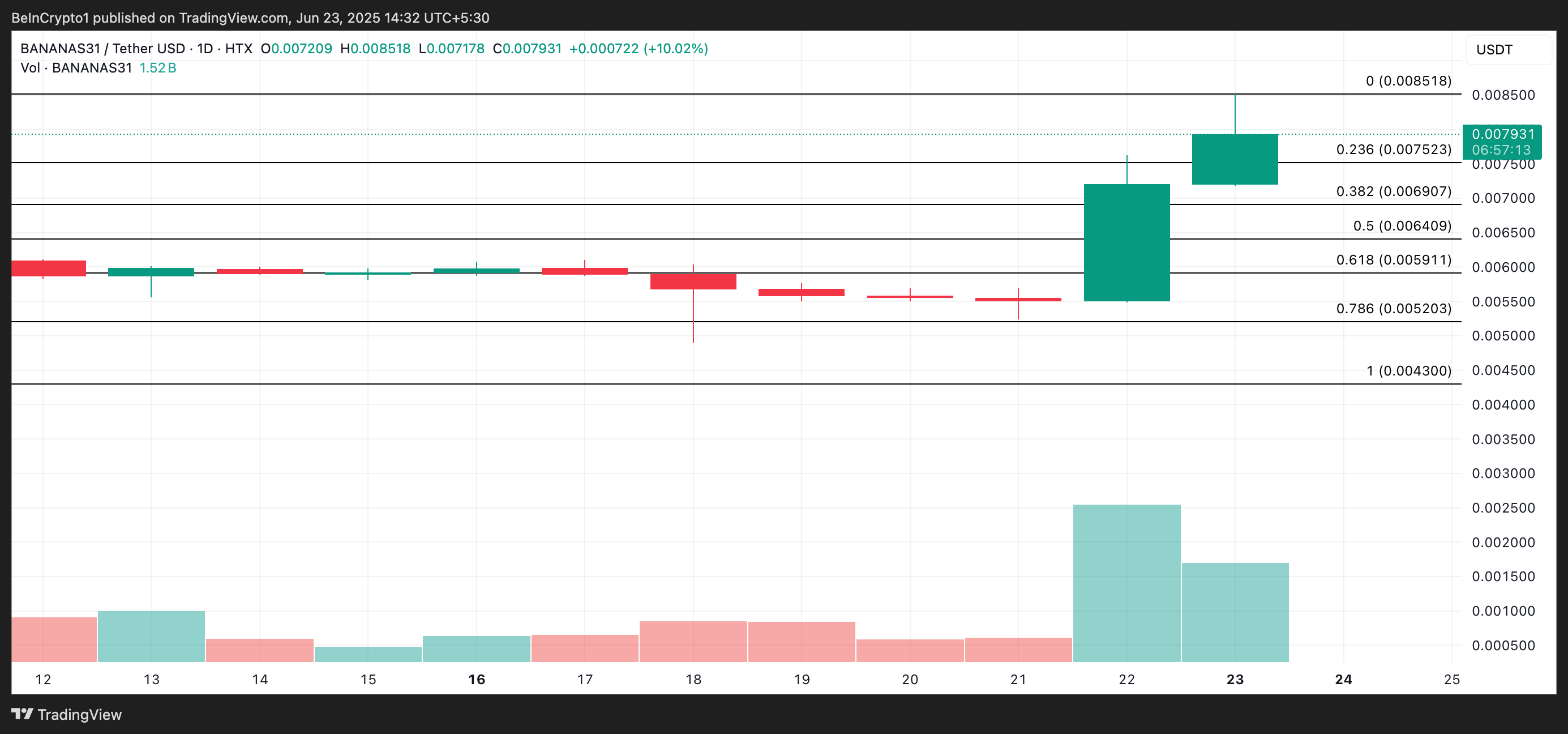 BANANAS31 on noussut 17 % ja sen hinta on 0,0079 dollaria kirjoitushetkellä. Se saavutti kaikkien aikojen korkeimman hintansa 0,0085 dollaria maanantain varhaisessa Aasian kaupankäyntisessiossa.