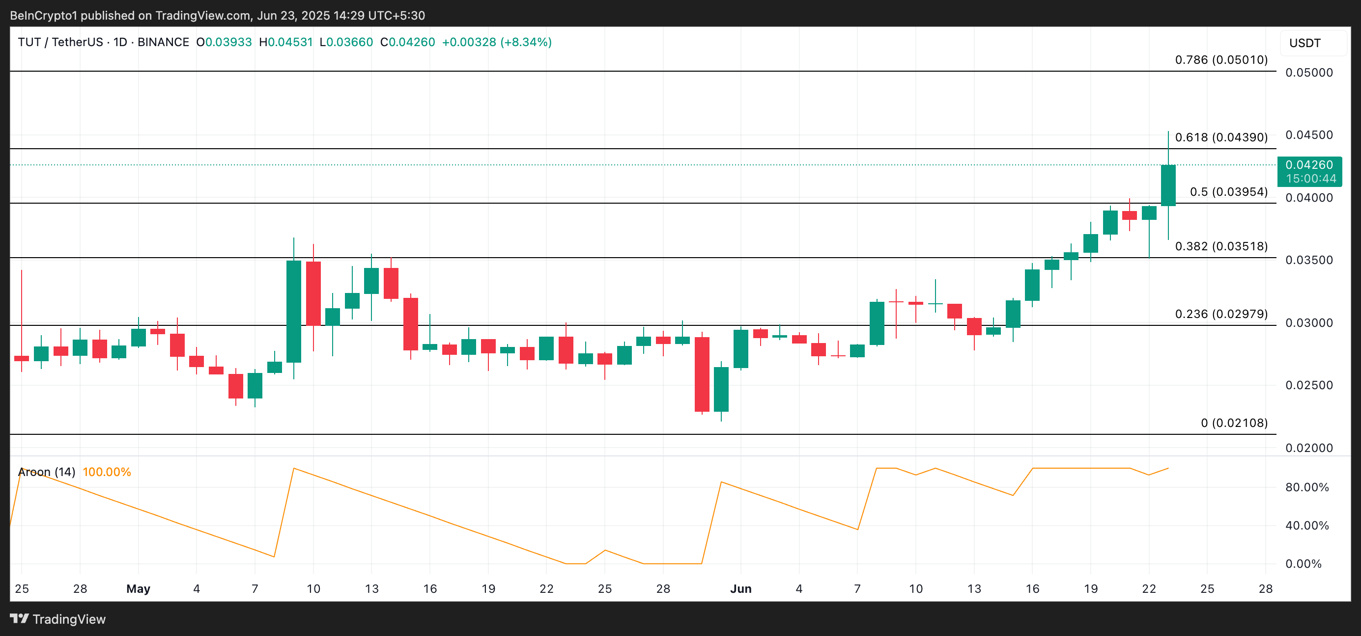Aroon-indikaattori on tekninen analyysityökalu, jota käytetään tunnistamaan trendin suunta ja vahvuus mittaamalla aika, joka on kulunut viimeisimmistä huipuista tai pohjista. Kun Aroon Up -linja on 100 %, omaisuusvara on saavuttanut viimeaikaisen huipun tarkastelujakson aikana, yleensä 25 jaksoa. Tämä pätee TUT:iin, joka tällä hetkellä vaihtaa omistajaa kolmen kuukauden korkeimmalla hinnalla 0,042 dollaria.