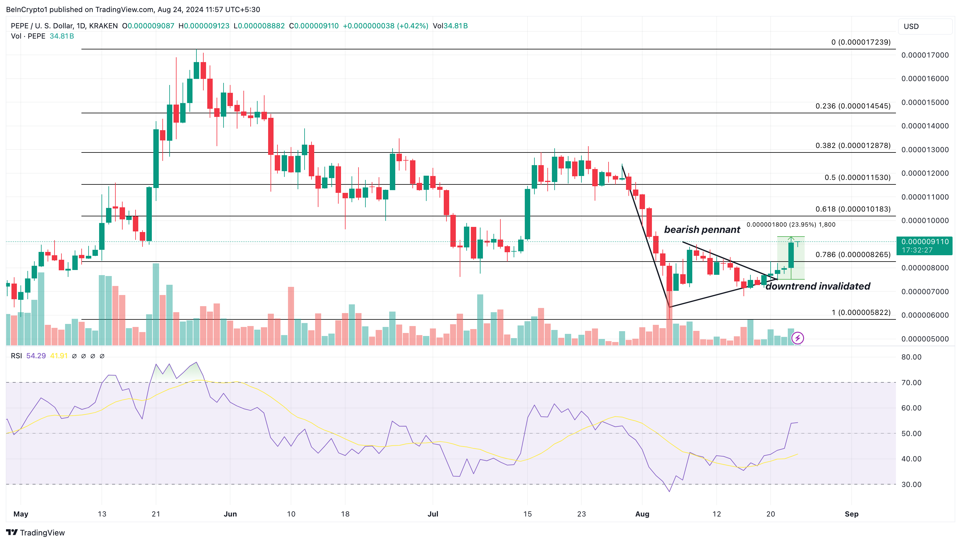 Lisäksi yllä oleva kaavio osoittaa, että RSI-lukema jatkaa nousuaan. Jos tämä suuntaus jatkuu, PEPEn hinta saattaa nousta 0,000010 dollariin, missä 61,8%:n kultainen tasku sijaitsee.