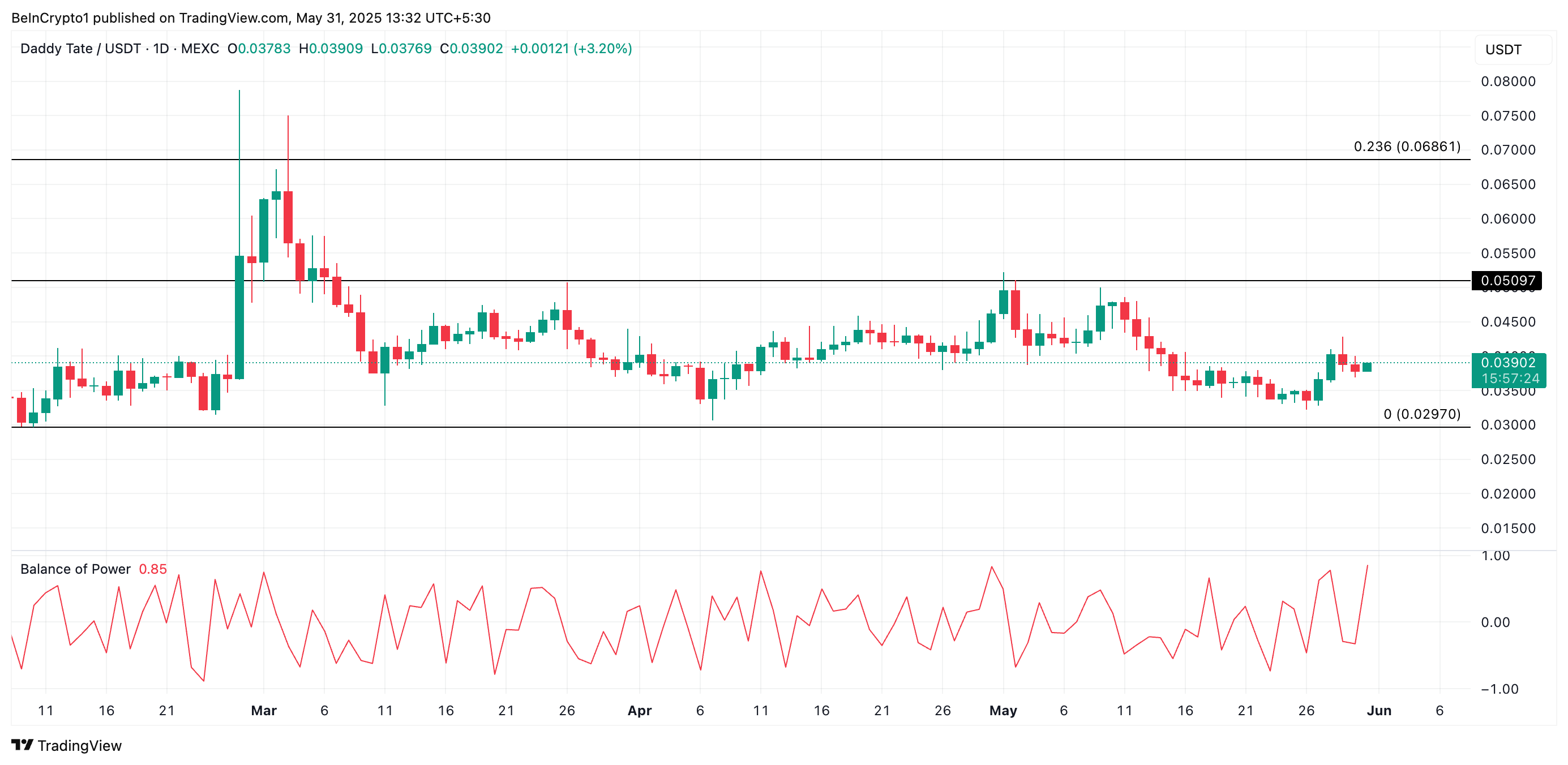 Tokenin nouseva Balance of Power (BoP) osoittaa ostopaineen tasaista nousua DADDY-kauppiaiden keskuudessa. Tätä kirjoitettaessa tämä tunnelmaindikaattori on 0,85.