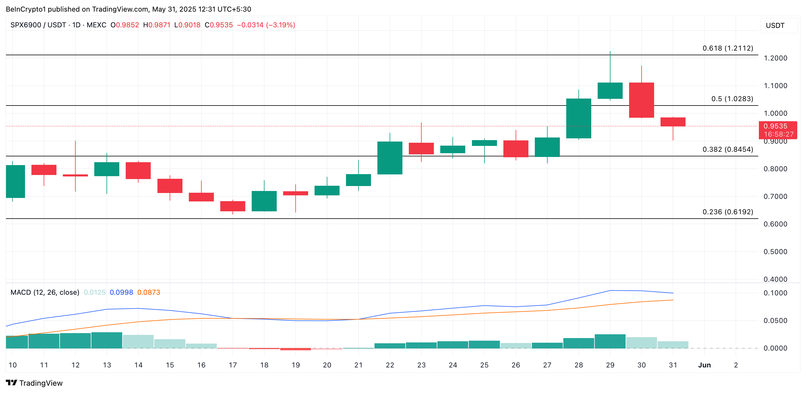 SPX on vastustanut viime viikon laajempaa markkinoiden hidastumista ja saavuttanut kaksinumeroisia voittoja. Noussut 11 % viimeisen viikon aikana, meemivara käy kauppaa hintaan 0,95 dollaria kirjoitushetkellä.