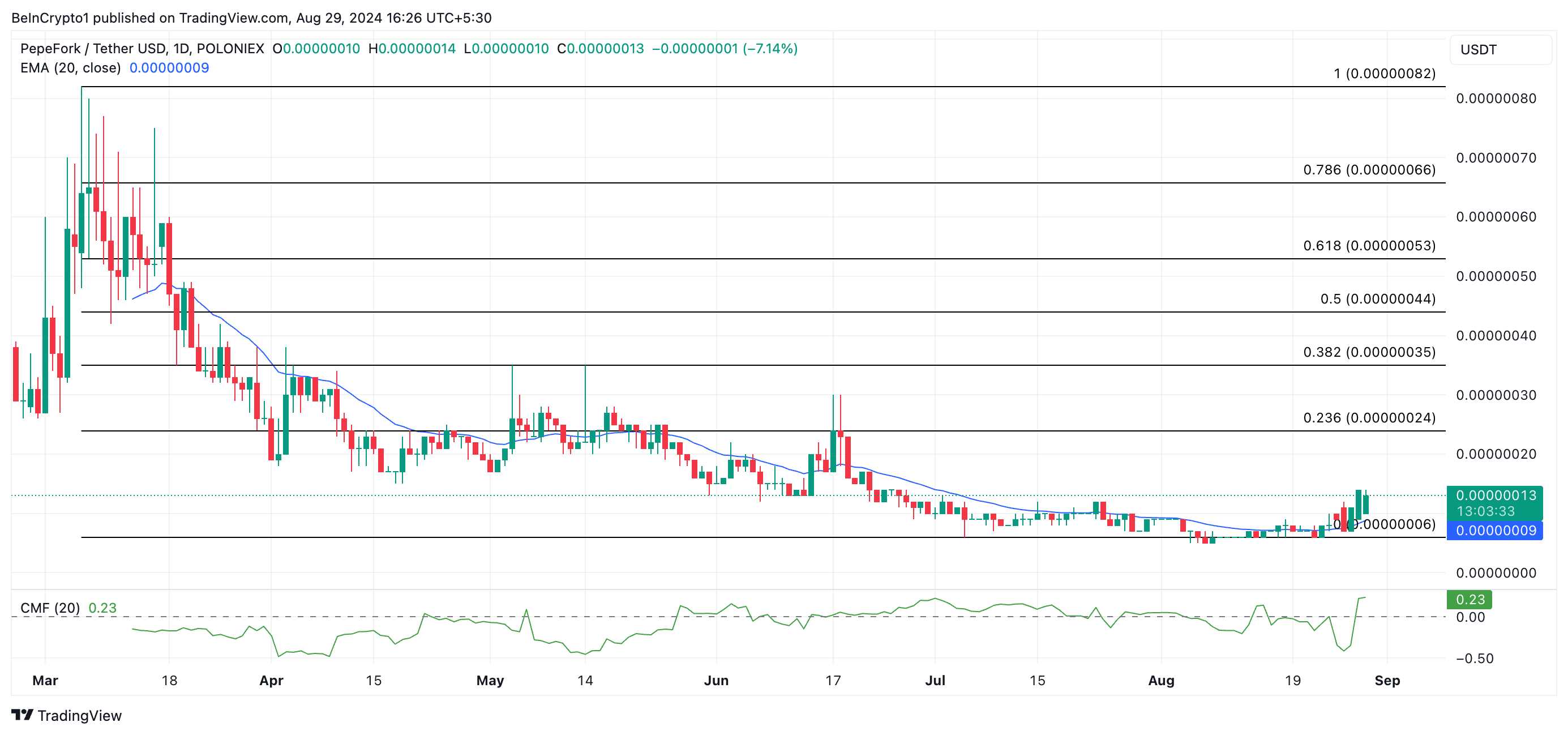 Lisäksi tokenin Chaikin Money Flow (CMF) on nousussa ja on tällä hetkellä 0,23, nollalinjan yläpuolella. CMF-arvo yli nollan osoittaa markkinavoimaa, mikä viestii likviditeetin sisääntulosta, mikä on ratkaisevan tärkeää rallin ylläpitämiseksi. Jos trendi pysyy, PORK saattaa vaihtaa omistajaa 0,00000024 dollarin hintaan.