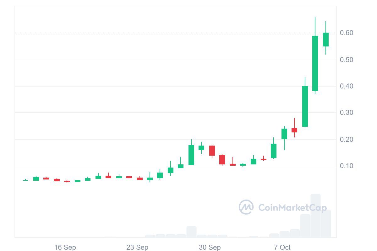 Skibidi Toilet on noussut tällä viikolla 368 %, tehden siitä yhden parhaiten suoriutuneista kryptovaluutoista. Meemikolikko hyppäsi 0,1298 dollarista 0,6081 dollariin, murtamalla tärkeitä vastustustasoja ja houkutellen kauppiaiden huomion sekä saavuttaen uuden kaikkien aikojen korkeimman hintansa 0,6604 dollaria.