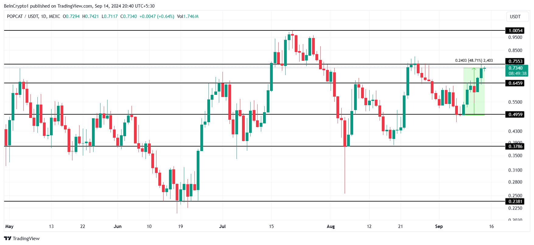 POPCAT osoitti vahvaa suorituskykyä tällä viikolla, vaikkakaan ei yhtä merkittävää kuin SUNDOG. Omaisuusvara koki 48,7% nousun pomppiessaan tukitasoltaan 0,49 dollaria. Tämä ralli nosti POPCATin hinnan 0,73 dollariin, ja nyt se pyrkii rikkomaan 0,75 dollarin rajan.