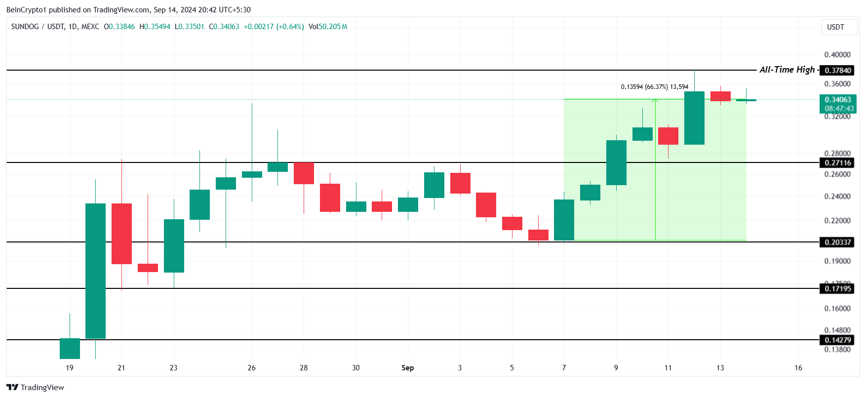 SUNDOGin hinta on noussut 66% viime viikon aikana, ja sen nykyinen hinta on 0,34 dollaria. Tämän hintarallin aikana se saavutti uuden kaikkien aikojen korkeimman tason, 0,378 dollaria, taso, joka saattaa ylittyä, jos härkätrendi jatkuu viikonlopun yli.