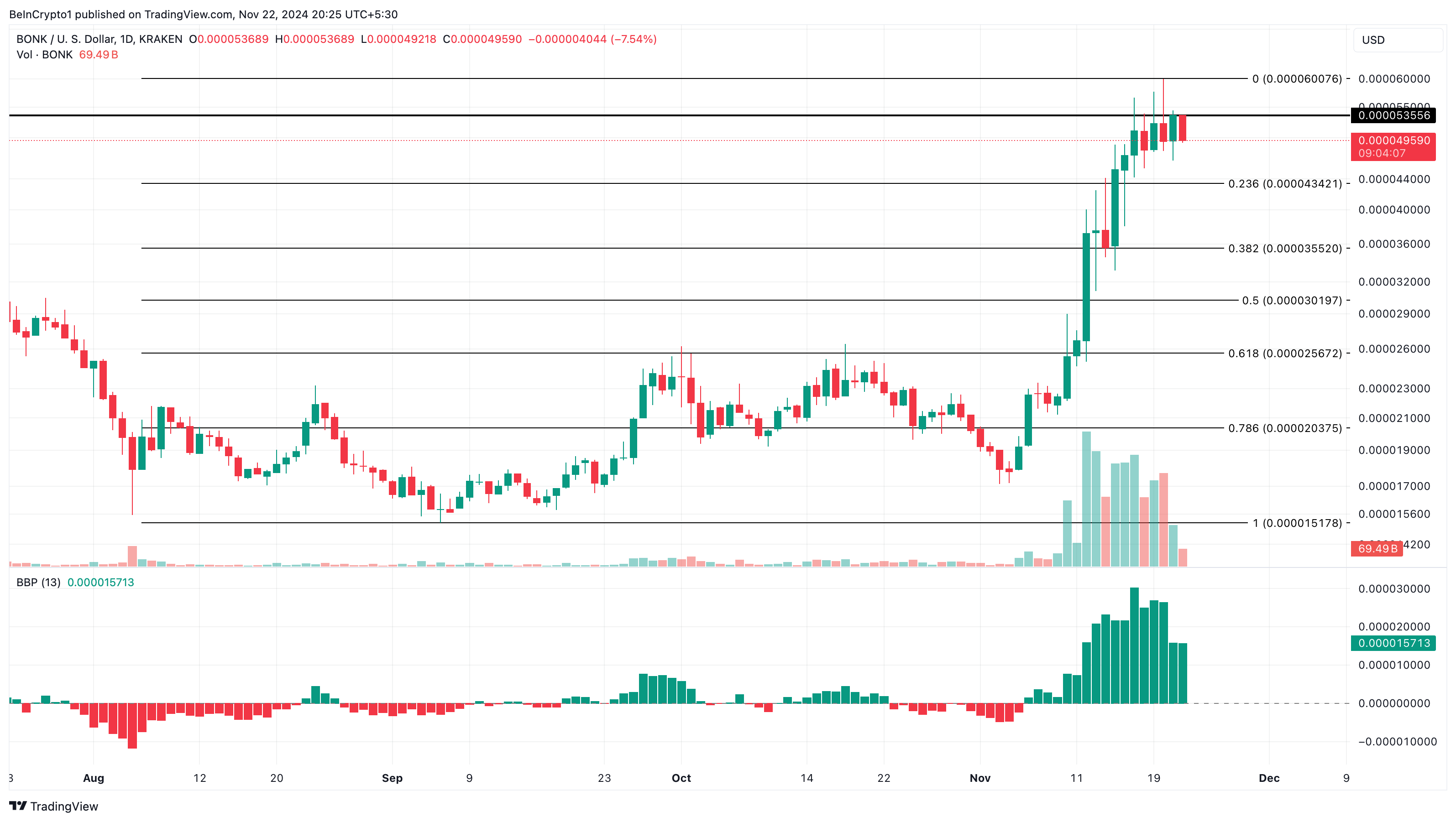 Siitä huolimatta Bull Bear Power (BBP) osoittaa, että karhut eivät vieläkään hallitse. Jos tämä jatkuu, BONK:n hinta voisi nousta kohti 0,000060 dollaria.