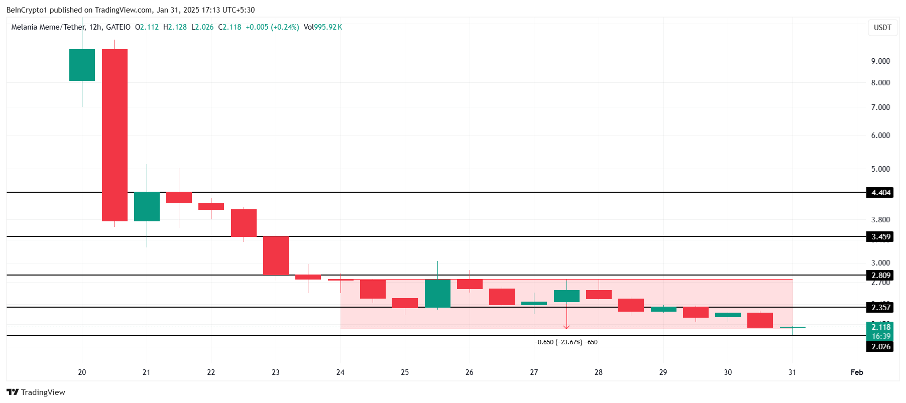 Jos MELANIA ei pysty pitämään 2,02 dollarin tukitasoa, lisätappiot voivat seurata. Lasku alle 2,00 dollarin altistaisi altcoinin lisääntyneelle karhupaineelle, mikä voisi johtaa pidempiin laskuihin.