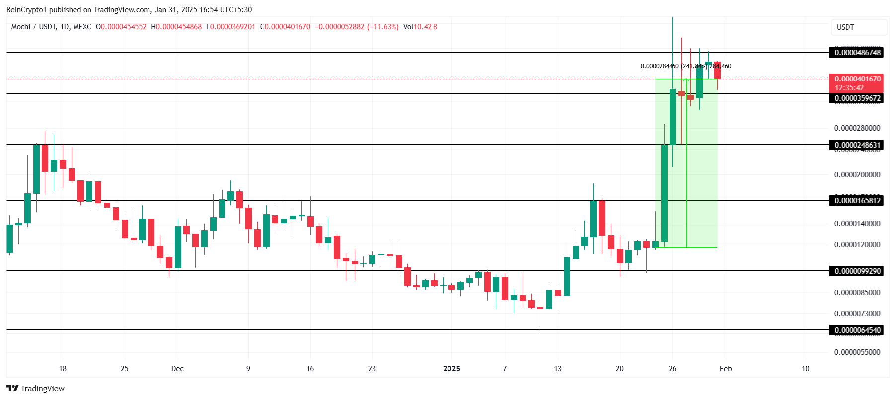 Jos MOCHI säilyttää tuen 0,00003596 dollarissa, nousutrendi voi jatkua. Keskeinen vastustaso on 0,00004867 dollaria, ja tämän esteen ylittäminen voisi nostaa meemikolikon kohti 0,00006000 dollarin rajaa. Tämä liike vahvistaisi nousutunnelmaa ja lisäisi sijoittajien kiinnostusta.