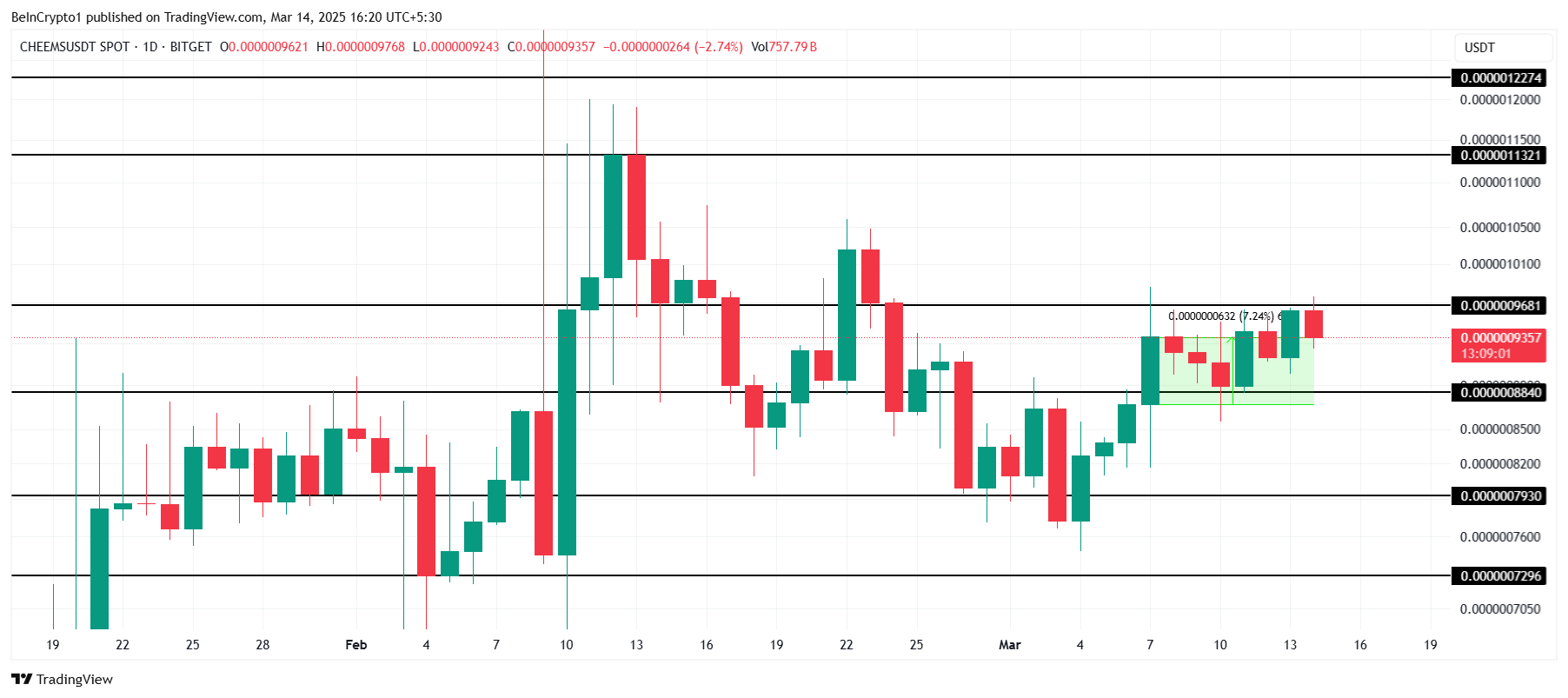 Tällä hetkellä CHEEMS yrittää ylittää 0,00000096 dollarin vastustason, toiveenaan ylittää 0,00000100 dollaria. Jos onnistuu, altcoin voisi mahdollisesti saavuttaa 0,00000113 dollaria, palauttaen osan viimeaikaisista tappioista.