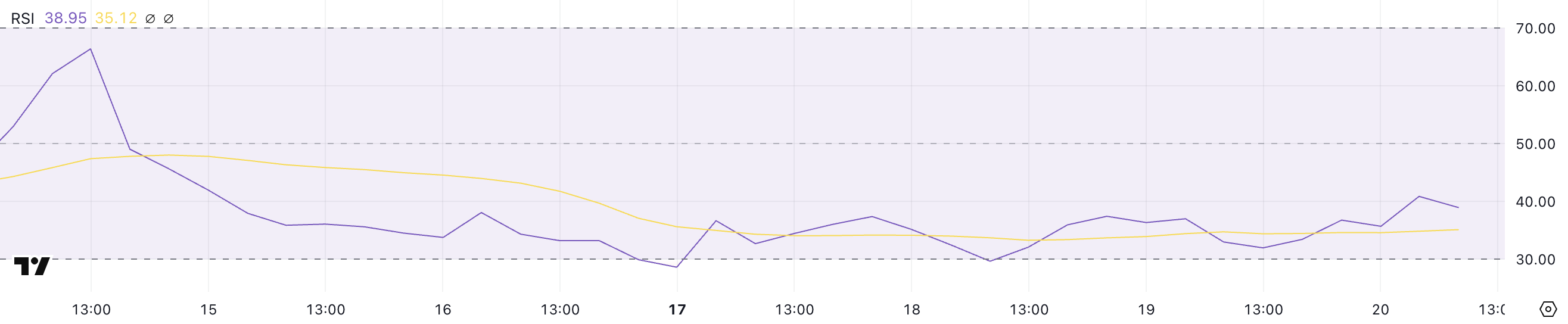 Relative Strength Index (RSI) on momentum-oskillaattori, joka mittaa hintaliikkeiden nopeutta ja muutosta. Se vaihtelee 0:sta 100:aan. RSI alle 30 osoittaa ylimyytyjä olosuhteita, mikä voi viitata ostopaikkaan, koska omaisuusvara saattaa olla aliarvostettu.