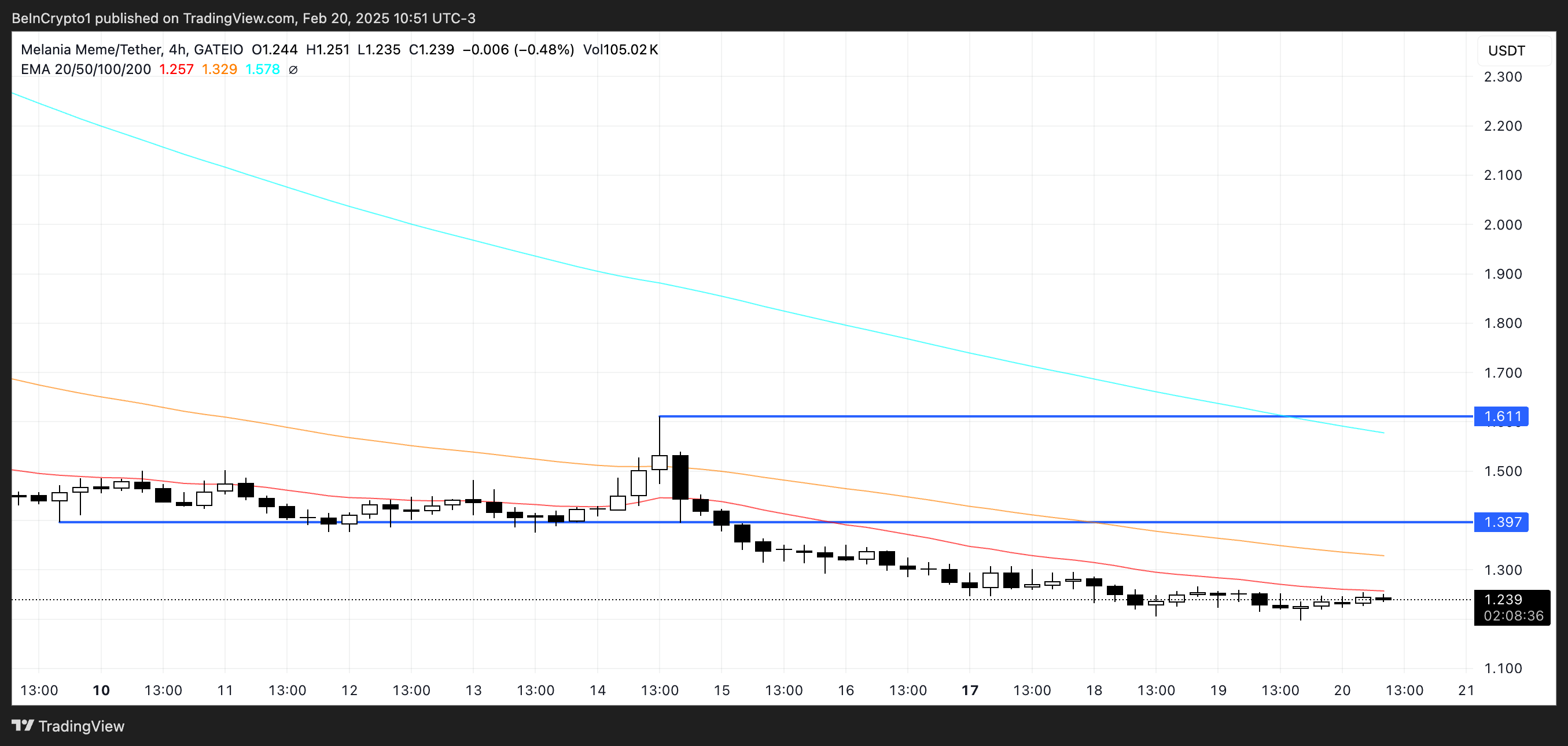 Jos omaisuusvara kuitenkin voi palauttaa härkämarkkinoiden tunnelman ja luoda nousutrendin, se voisi testata vastustason 1,39 dollarissa. Tämän vastustason läpäiseminen osoittaisi uudelleen herännyttä ostokiinnostusta, mikä voisi nostaa MELANIA:n 1,61 dollariin.