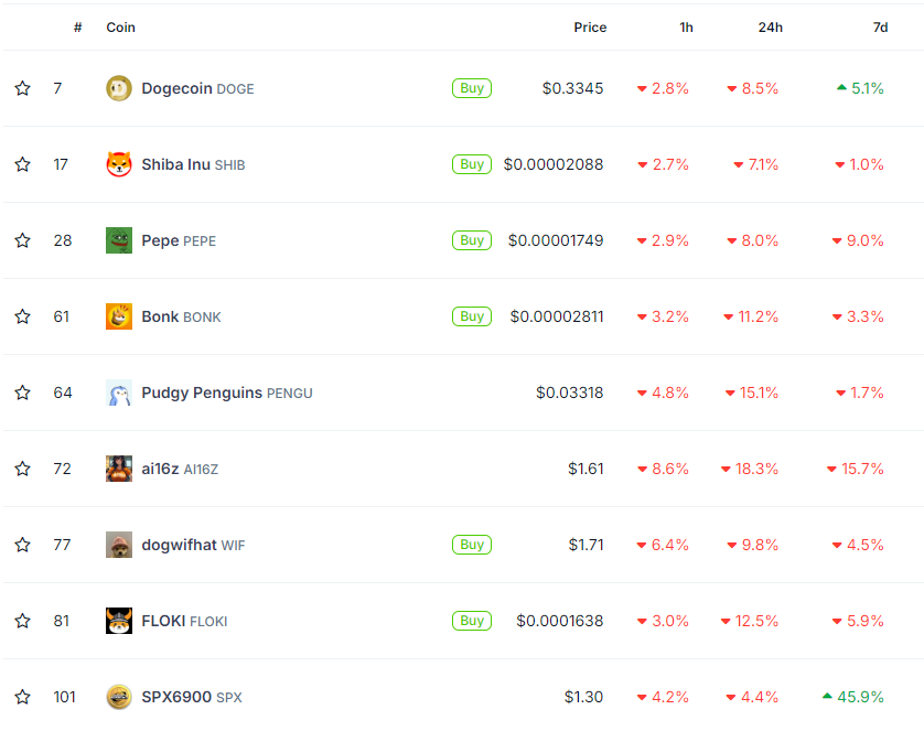 Laskut suurimpien meemikolikoiden joukossa ovat olleet erityisen vakavia. Suositut meemikolikot kuten Dogecoin ja Shiba Inu kokivat suuria pudotuksia 24 tunnin kaaviossa, mikä painoi meemikolikoiden markkina-arvoa alaspäin.