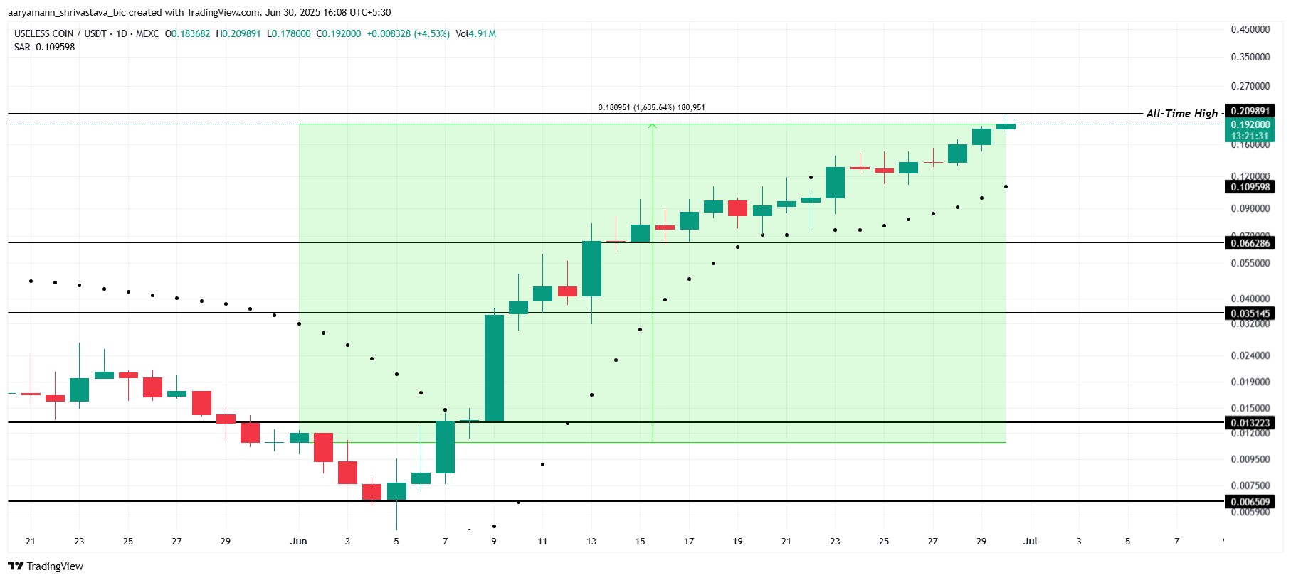 USELESS johti meemikolikkomarkkinoita kesäkuussa räjähtävällä 1 635 % nousulla, saavuttaen uusia kaikkien aikojen huippuja lähes päivittäin. Altcoin saavutti viimeisimmän ATH:nsa tänään 0,209 dollarissa. Tämä kasvu osoittaa vaikuttavaa suuntausta, ja sijoittajat seuraavat tarkasti lisänousuja.
