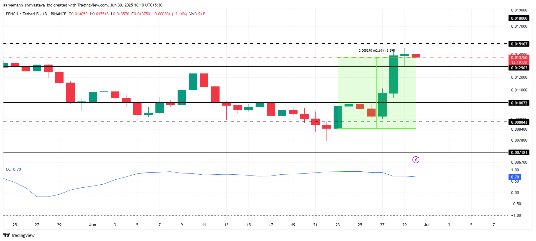 PENGU aloitti kesäkuun kivikkoisesti, mutta on saanut merkittävää vauhtia viime viikolla. Meemikolikko nousi 62,6 %, saavuttaen 0,0137 dollaria, mikä on kahden kuukauden huippu. Tämä viimeaikainen nousu osoittaa altcoinin kyvyn palautua aiemmista vaikeuksista, mikä herättää sijoittajien huomion.