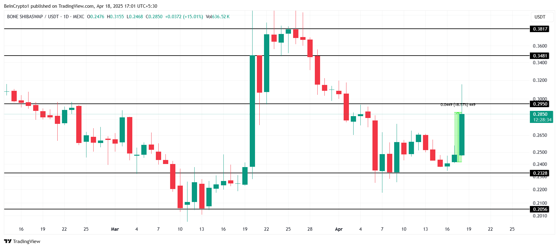 BONE nousi vaikuttavasti 18,5 % viimeisen 24 tunnin aikana, ja sen kaupankäyntihinta oli 0,285 dollaria. Altcoin on tällä hetkellä avainvastuksen 0,295 dollaria alapuolella. Viimeaikaisen tunnelman perusteella se näyttää olevan valmis murtamaan tämän tason, mikä viittaa mahdolliseen noususuuntaan tokenille lähitulevaisuudessa.