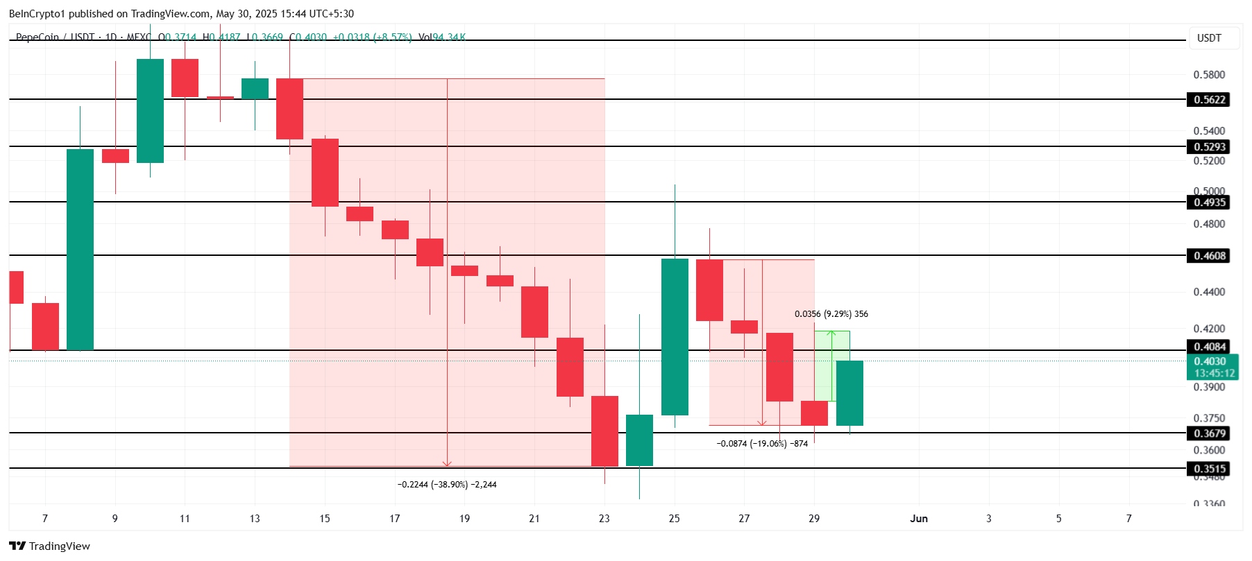 PEPECOIN ylittää monia altcoineja, nousten 9,2 % viimeisen 24 tunnin aikana, ja sen hinta on tällä hetkellä 0,403 dollaria. Huolimatta viimeaikaisista nousuista, altcoin käy kauppaa varovaisesti, kun sijoittajat seuraavat kestävää suuntausta.