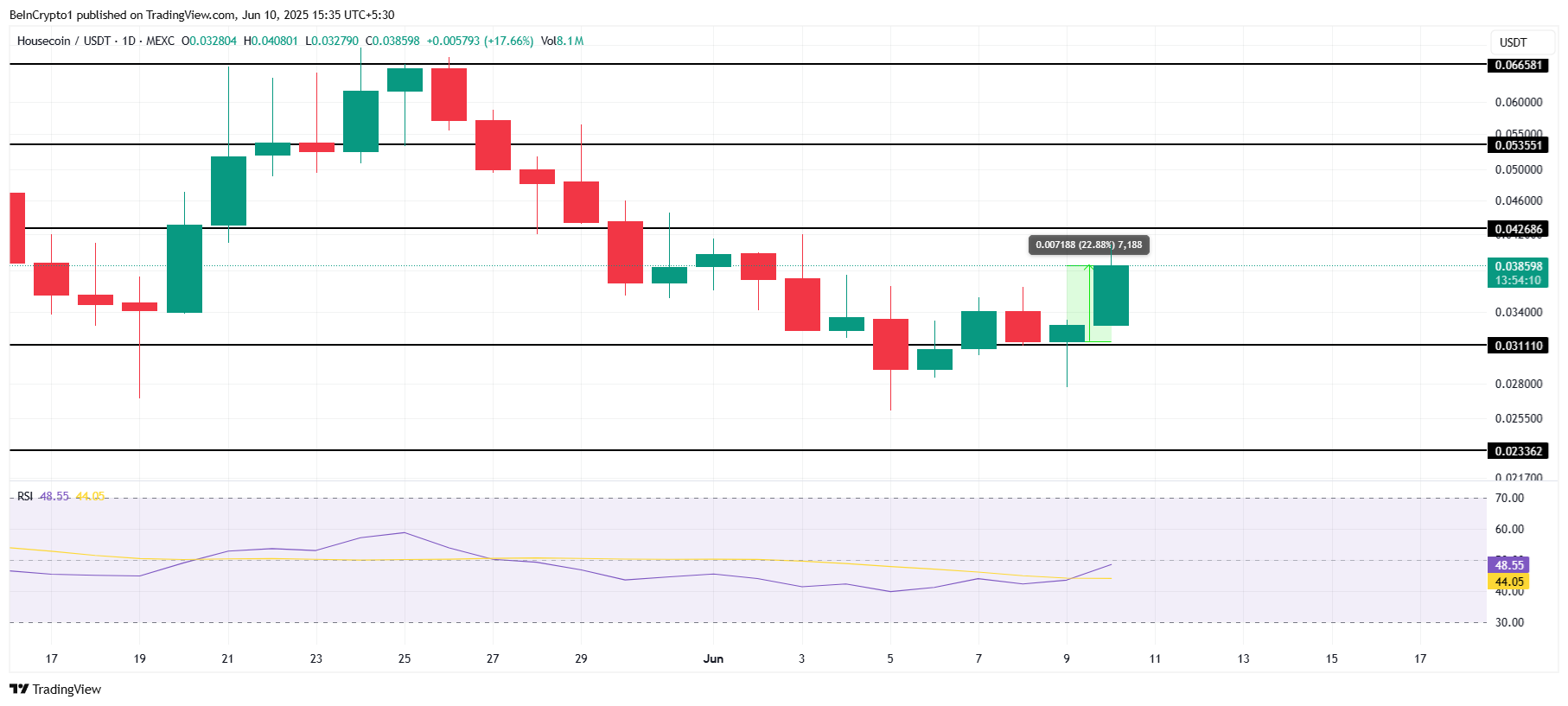 HOUSE on noussut päivän parhaiten suoriutuvien meemikolikoiden joukkoon, nousten 22 % viimeisen 24 tunnin aikana. Tällä hetkellä kolikko käy kauppaa hintaan 0,038 dollaria, ja sen vahva hintaliike osoittaa kasvavaa kiinnostusta. Jos nykyinen suuntaus jatkuu, HOUSE voi murtautua keskeisten vastustasojen läpi ja nousta edelleen.