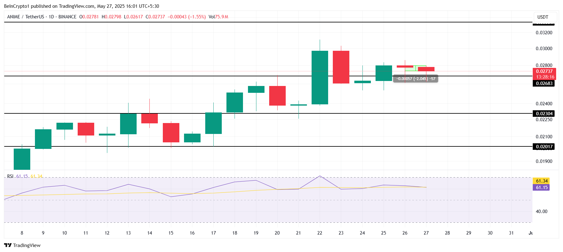 • Anime pysyy vakaana yli 0,0268 dollarin tukitason, ja RSI osoittaa nousuvaraa; epäonnistuminen voi laskea sen 0,023 dollariin.