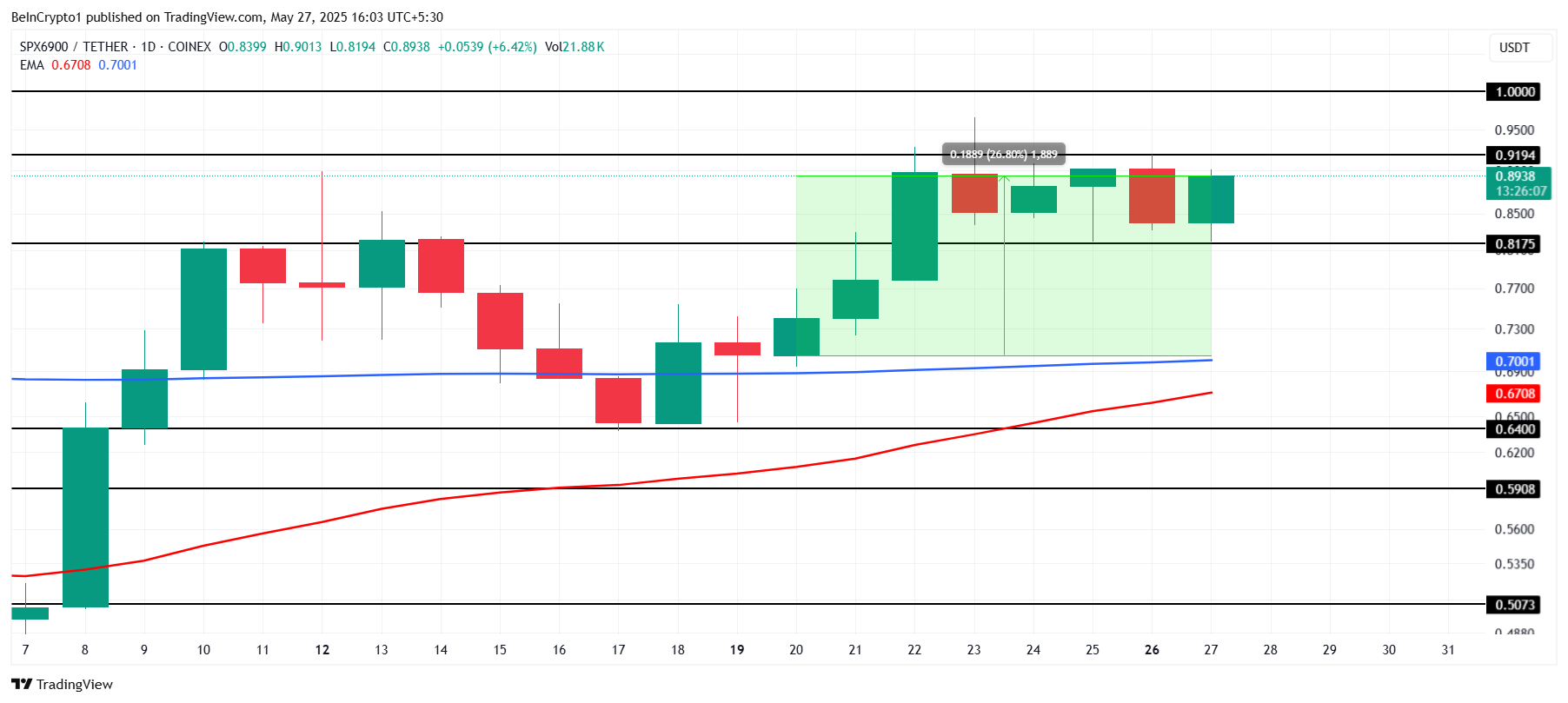 SPX nousi 26 % viime viikolla ja on tällä hetkellä 0,89 dollarissa. Meemikolikko on palauttanut viimeisen 24 tunnin tappiot, mutta pysyy juuri alle 0,91 dollarin vastustason. Tämä palautuminen heijastaa kasvavaa sijoittajien kiinnostusta ja mahdollisuutta lisänousuihin.