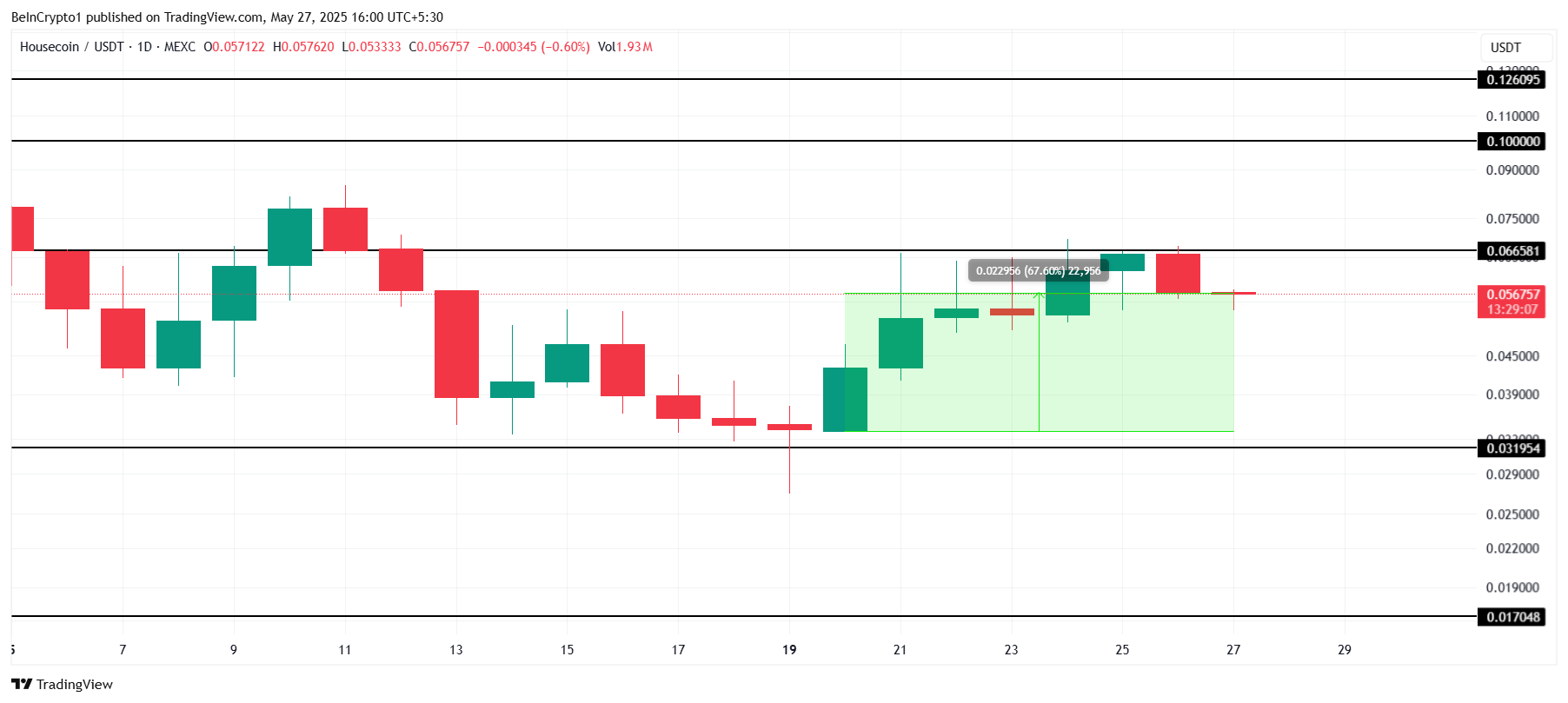 Epäonnistuminen rikkoa 0,066 dollaria voisi altistaa HOUSE:n myyntipaineelle. Lasku 0,031 dollariin mitätöisi nousujohteisen näkymän ja viittaisi markkinatunnelman siirtymiseen varovaisuuteen.