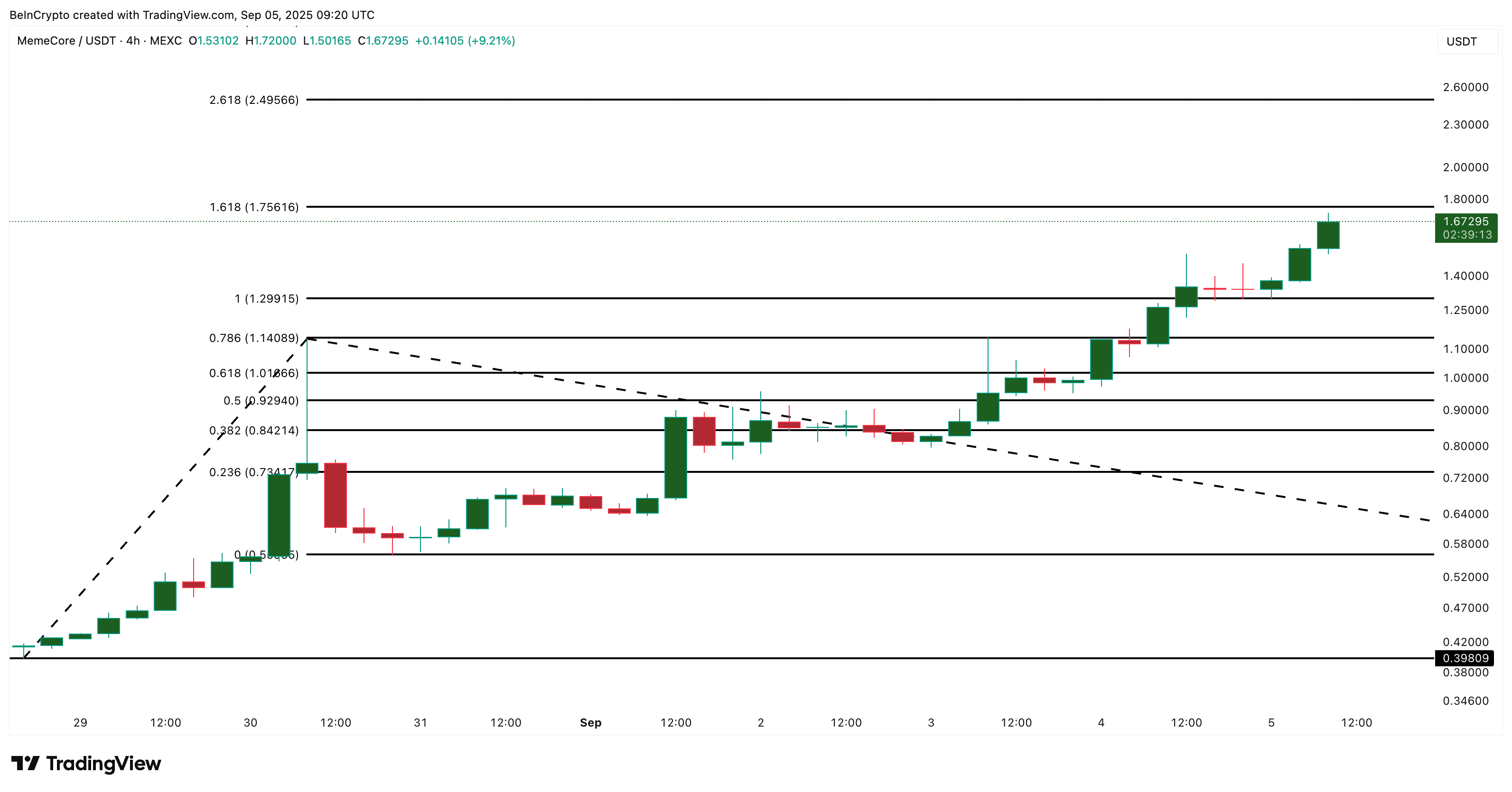 MemeCore on muuttunut yhdeksi markkinoiden nopeimmin liikkuvista kolikoista. Kirjoitushetkellä tokenin hinta on lähellä 1,68 dollaria, mikä tarkoittaa 40 % nousua viimeisen 24 tunnin aikana. Seitsemän päivän tarkastelussa voitot ovat lähes 276 %, ja kolikko saavuttaa uusia kaikkien aikojen huippuja lähes päivittäin. Kauppiaat kysyvät nyt, onko liikkeellä vielä voimaa.