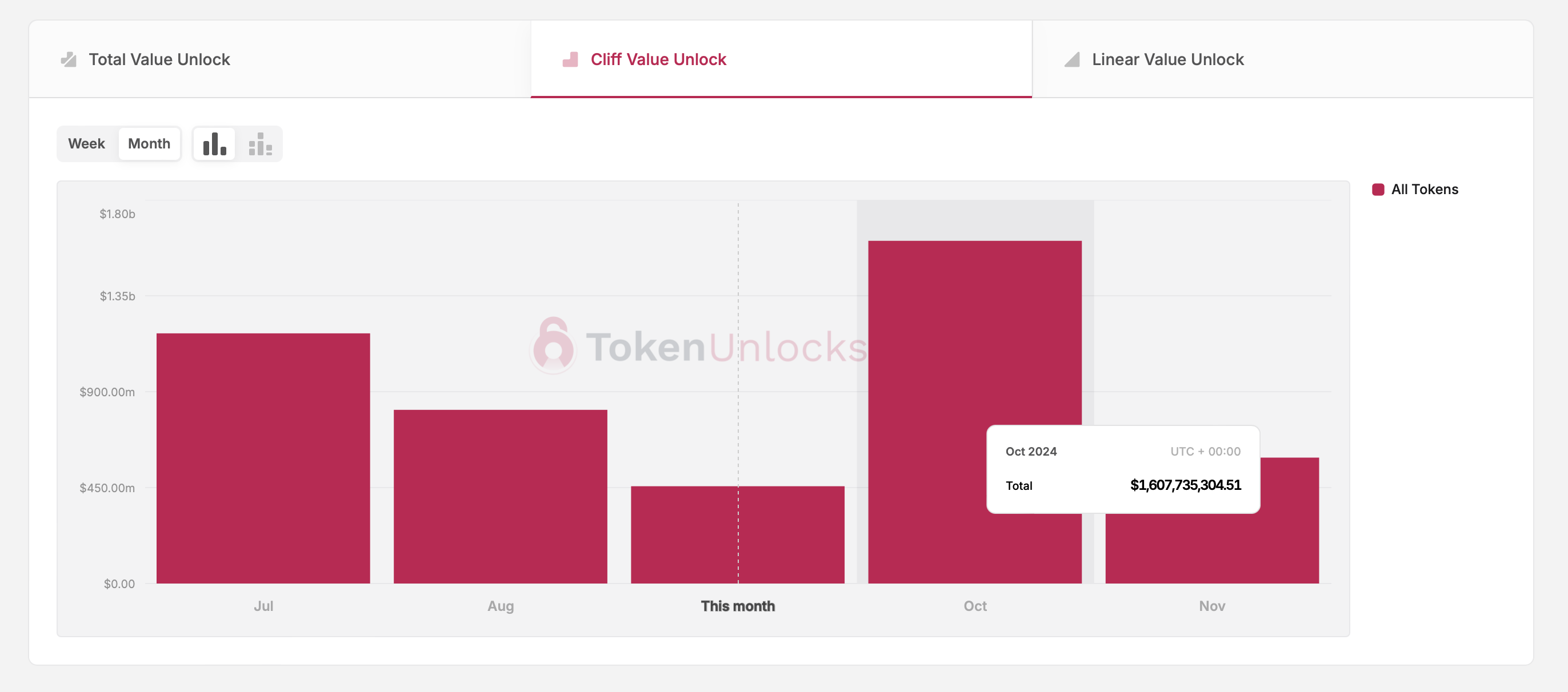 TokenUnlocks-tietojen mukaan noin 1,6 miljardin dollarin arvosta tämän kuukauden tokenien vapautuksia luokitellaan cliff-vapautuksiksi. Tokenien vapautustapahtumien yhteydessä cliff tarkoittaa tokeneita, jotka vapautetaan aikataulun mukaan, joka on säännöllisempi kuin päivittäinen, kuten viikoittain, kuukausittain tai vuosittain.