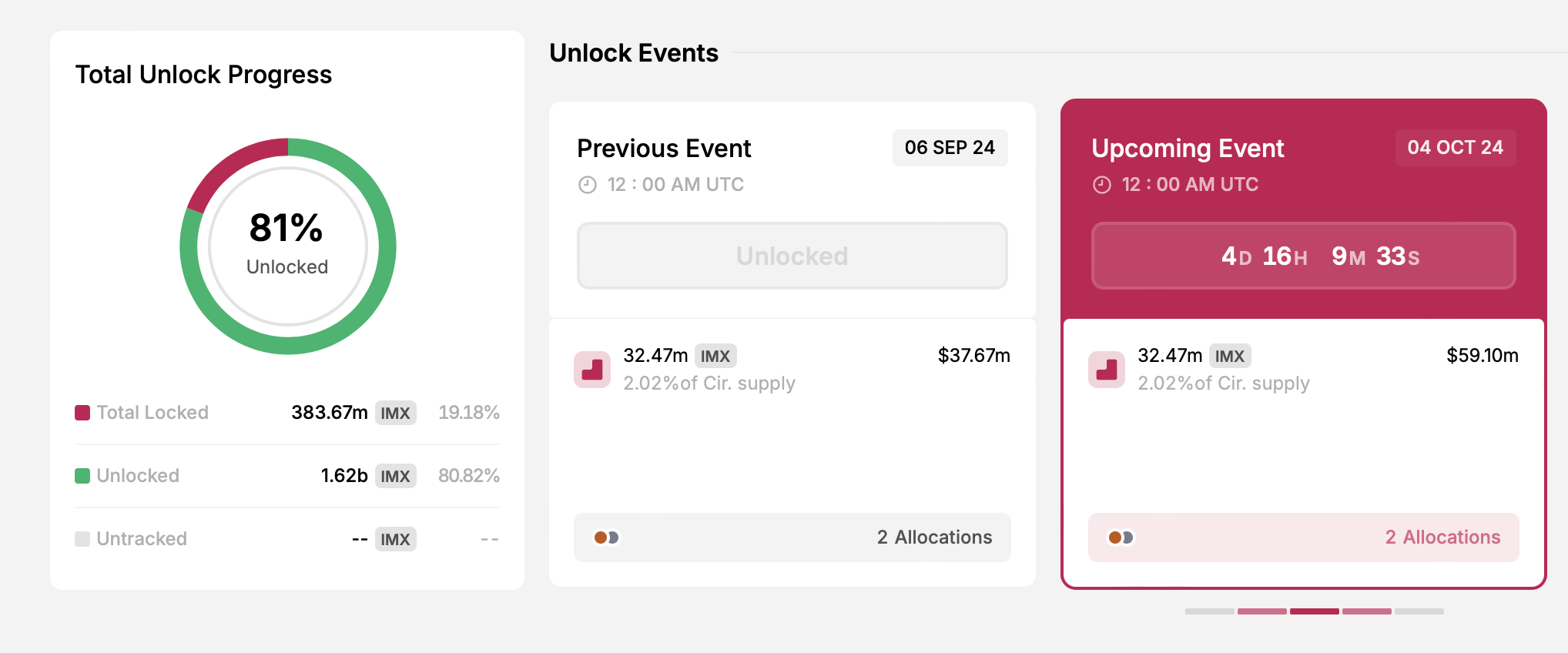 Seuraavana Sui:n jälkeen Immutable vapauttaa 4. lokakuuta 32,47 miljoonaa IMX-tokenia. Näiden tokenien arvo on noin 59,10 miljoonaa dollaria, mikä vastaa 2,02 % IMX:n kiertävästä tarjonnasta. Ne jaetaan ekosysteemin ja projektikehityksen kesken, yksityiskohdat ovat seuraavat: