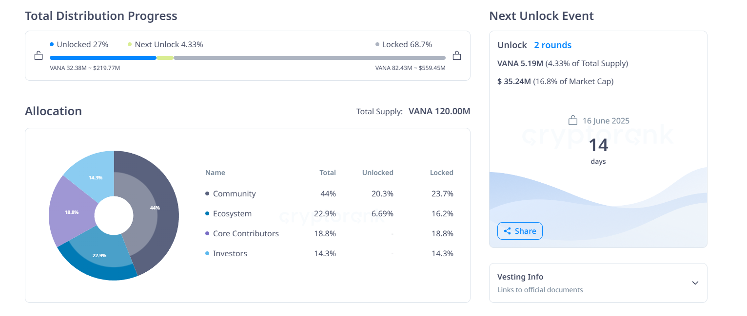 - Avattavien Tokenien Määrä: 5,19 miljoonaa VANA (4,33 % kokonaismäärästä)