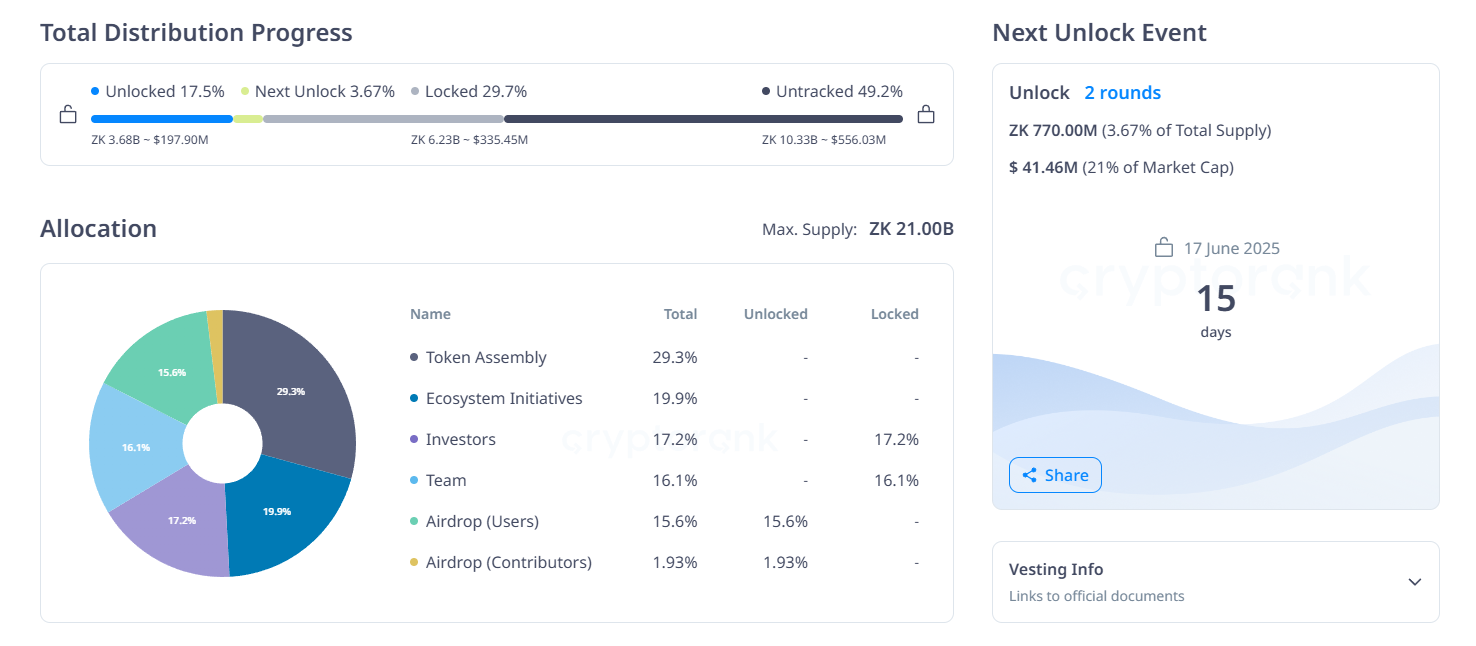 17. kesäkuuta avataan 770 miljoonaa ZK-tokenia—arvoltaan noin 41,61 miljoonaa dollaria. Näistä 397,20 miljoonaa tokenia (11 %) on allokoitu sijoittajille ja 372,80 miljoonaa tokenia (11 %) tiimin jäsenille.