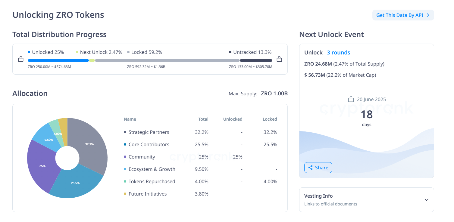 20. kesäkuuta LayerZero avaa 24,68 miljoonaa ZRO-tokenia. Avattujen omaisuuserien arvo on noin 56,72 miljoonaa dollaria.