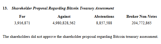 X:ssä jaettujen asiakirjojen mukaan osakkeenomistajien ehdotus sai vain 3,9 miljoonaa ääntä puolesta, kun taas yli 4,9 miljardia vastusti sitä. Lisäksi 8,9 miljoonaa osaketta pidättäytyi äänestämästä, ja 205 miljoonaa oli välittäjien ei-ääniä.