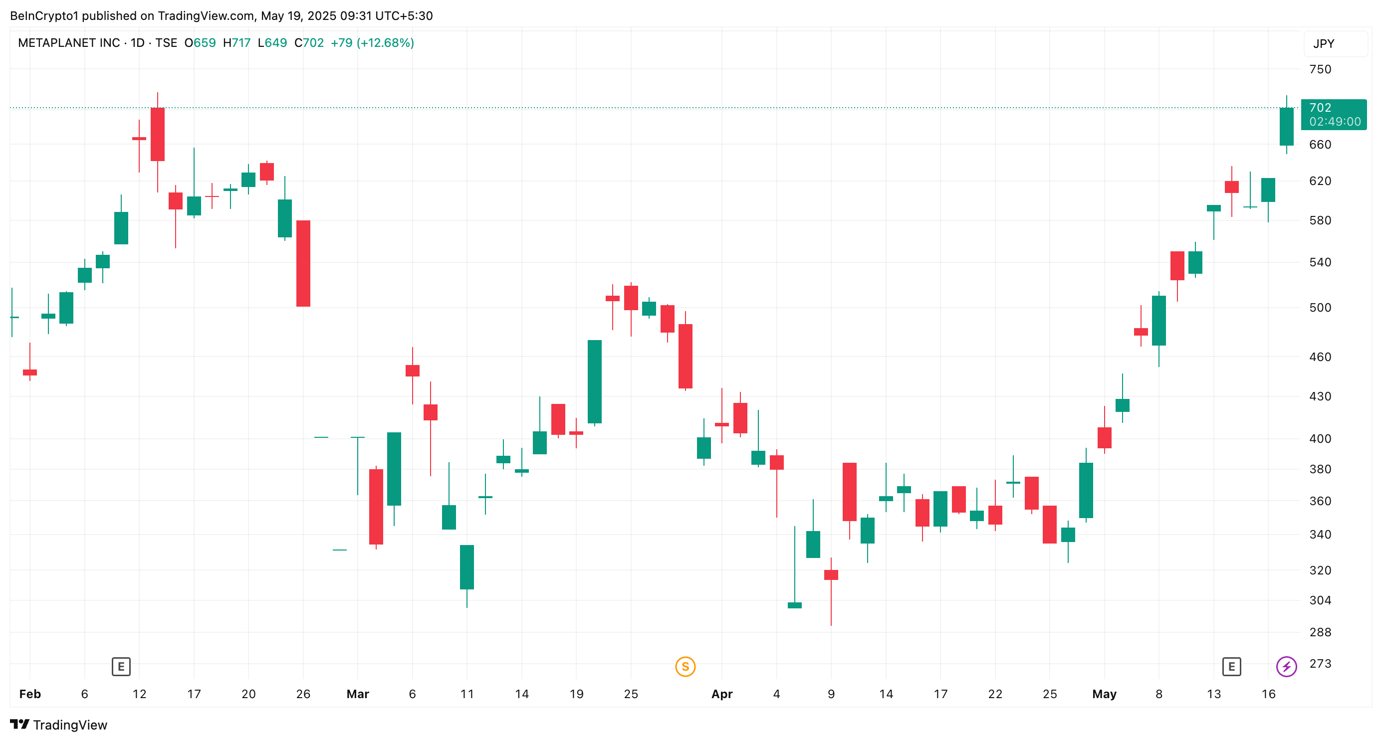 Samaan aikaan uutisten jälkeen Metaplanetin osake, 3350.T, nousi 12,6 %, Yahoo Financen tietojen mukaan. Julkaisuhetkellä sen kaupankäyntihinta oli 702 jeniä (4,8 dollaria), mikä merkitsi korkeuksia, jotka nähtiin viimeksi 13. helmikuuta.