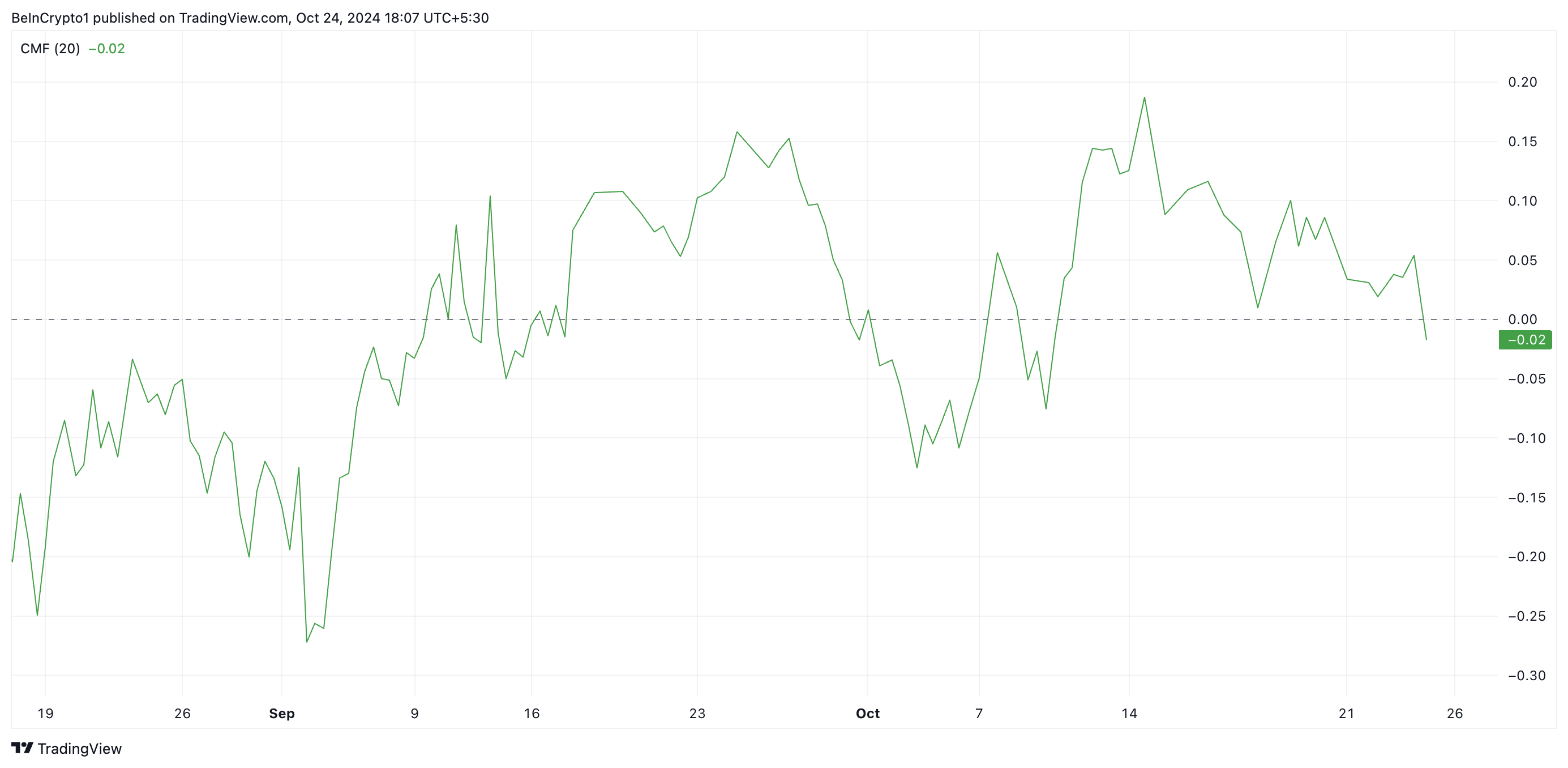 CMF mittaa rahavirtoja omaisuusvaraan ja siitä pois. Kun sen arvo on alle 1, se viittaa siihen, että myyntipaine on hallitseva, mikä osoittaa, että omaisuusvarasta virtaa enemmän rahaa ulos kuin sisään. Se on merkki siitä, että sijoittajat vähentävät positioitaan, mikä vähentää jatkuvan nousutrendin todennäköisyyttä.