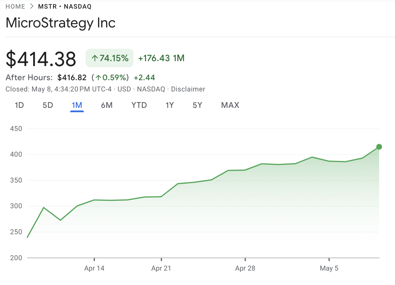 Strategyn osake on noussut Bitcoinin voittojen myötä viime aikoina. MSTR nousi tänään 7 % ja 75 % viime kuukauden aikana huolimatta suurista tappioista maaliskuun alussa ja Q1:ssä.