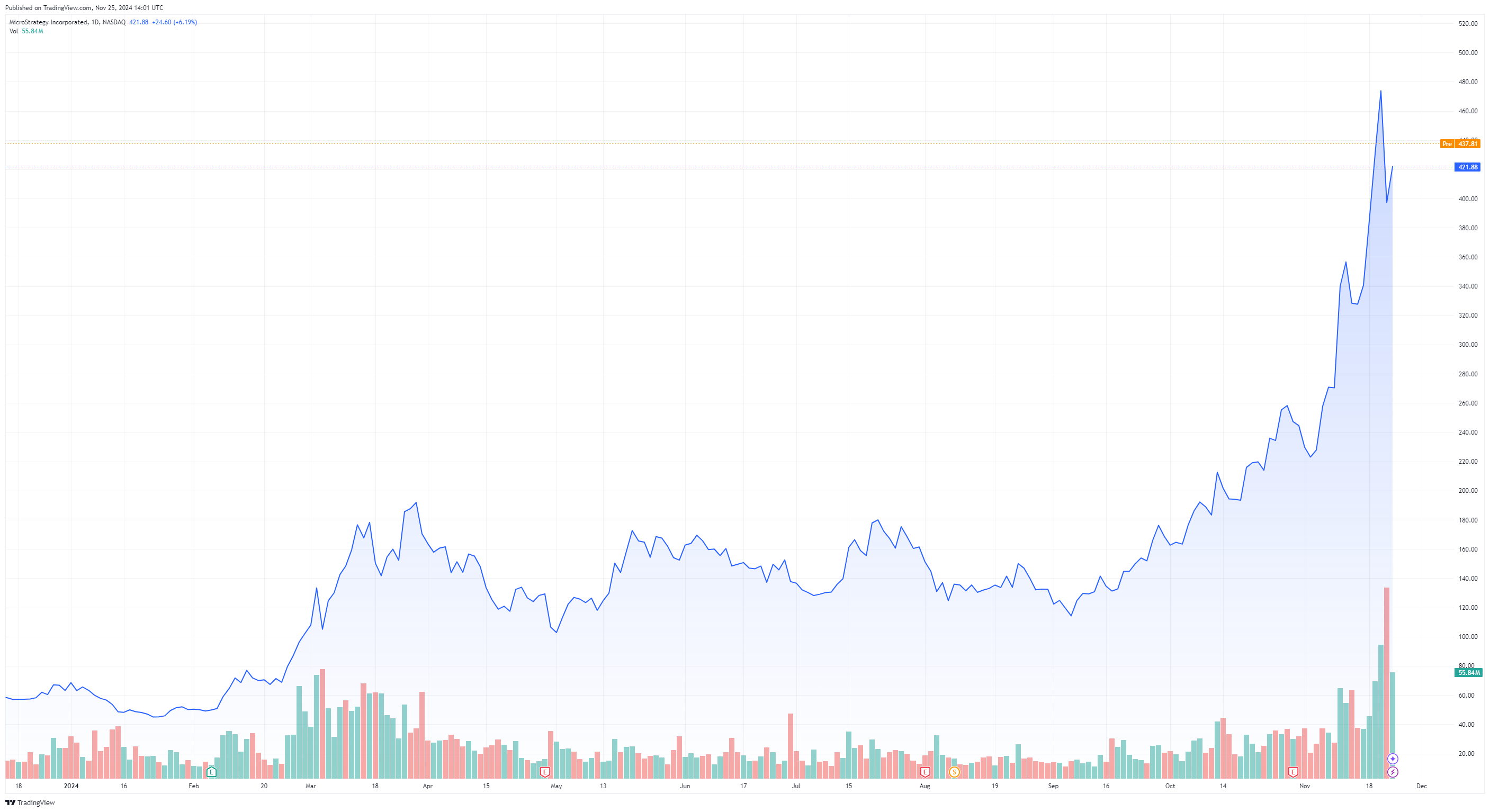 MicroStrategy-osakkeen (MSTR) hinta nousussa marraskuussa