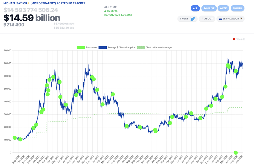 Tällä hetkellä MicroStrategy omistaa 214 400 BTC:tä, joiden arvo on noin 14,59 miljardia dollaria, mikä tuottaa yli 92,37 prosentin realisoitumattoman voiton.