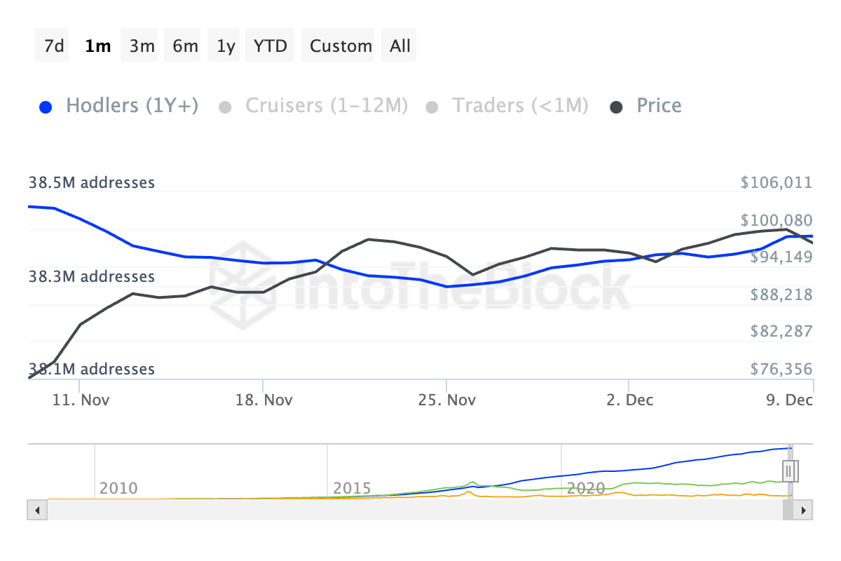 Lisäksi näiden sijoittajien kolikon hallussapitojaksojen lyheneminen vahvistaa heidän voittojen kotiuttamistottumuksensa. IntoTheBlockin mukaan viimeisten 30 päivän aikana BTC:n LTH:t ovat vähentäneet kolikon hallussapitoaikaansa 0,06 %.